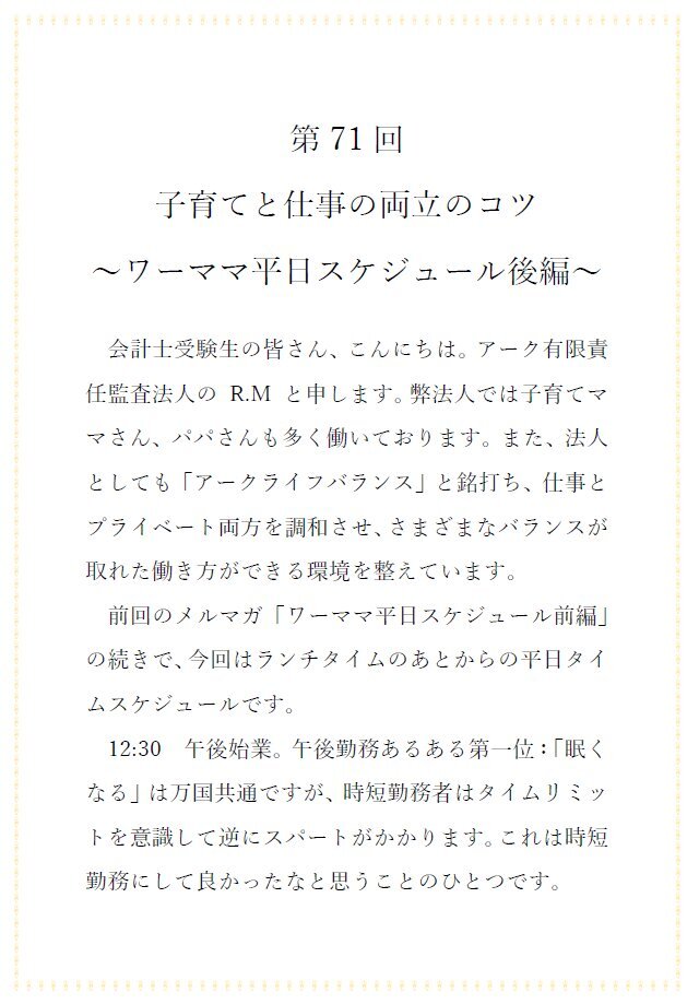 子育てと仕事の両立のコツ~平日スケジュール後編~ アークマガジン第71弾を掲載しました! 続きはこちらからご覧ください👧 recruit.ark-audit.com/voice/ #会計士受験生 #論文式試験 #監査法人 pic.x.com/e3S52riQUp