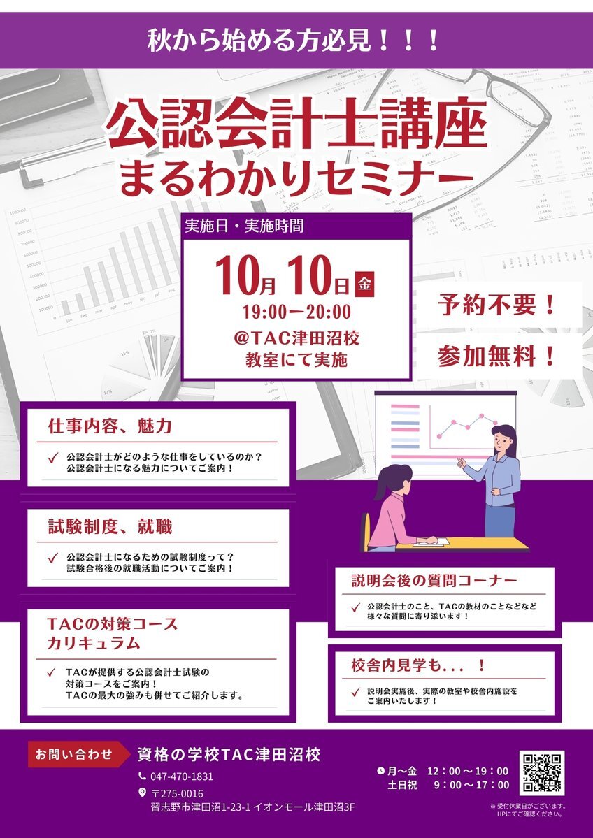 ╔===================╗       TAC津田沼校開催!      #公認会計士 講座説明会 ╚===================╝ 🕖日時:10/10(金) 19:00~ 📍場所:TAC津田沼校307教室 参加無料・予約手続不要! お気軽にご参加ください! お待ちしております🔥 #TAC会計士 #公認会計士試験