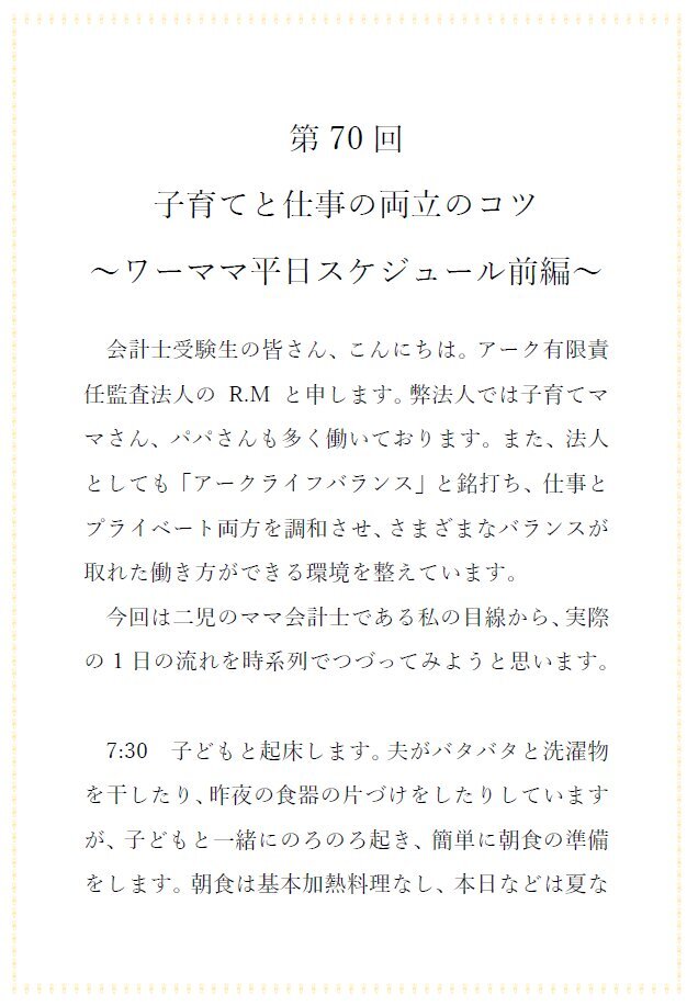 子育てと仕事の両立のコツ~平日スケジュール前編~ アークマガジン第70弾を掲載しました! 続きはこちらからご覧ください👧 recruit.ark-audit.com/voice/ #会計士受験生 #論文式試験 #監査法人 pic.x.com/tSImlrAl1s