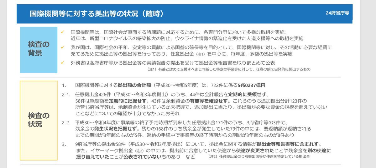 国の省庁などが国際機関に拠出した資金について、会計検査院が調査したところ、必要性を確認しないまま資金が出されていたケースが123件。会計検査院 x.com/i/broadcasts/1…