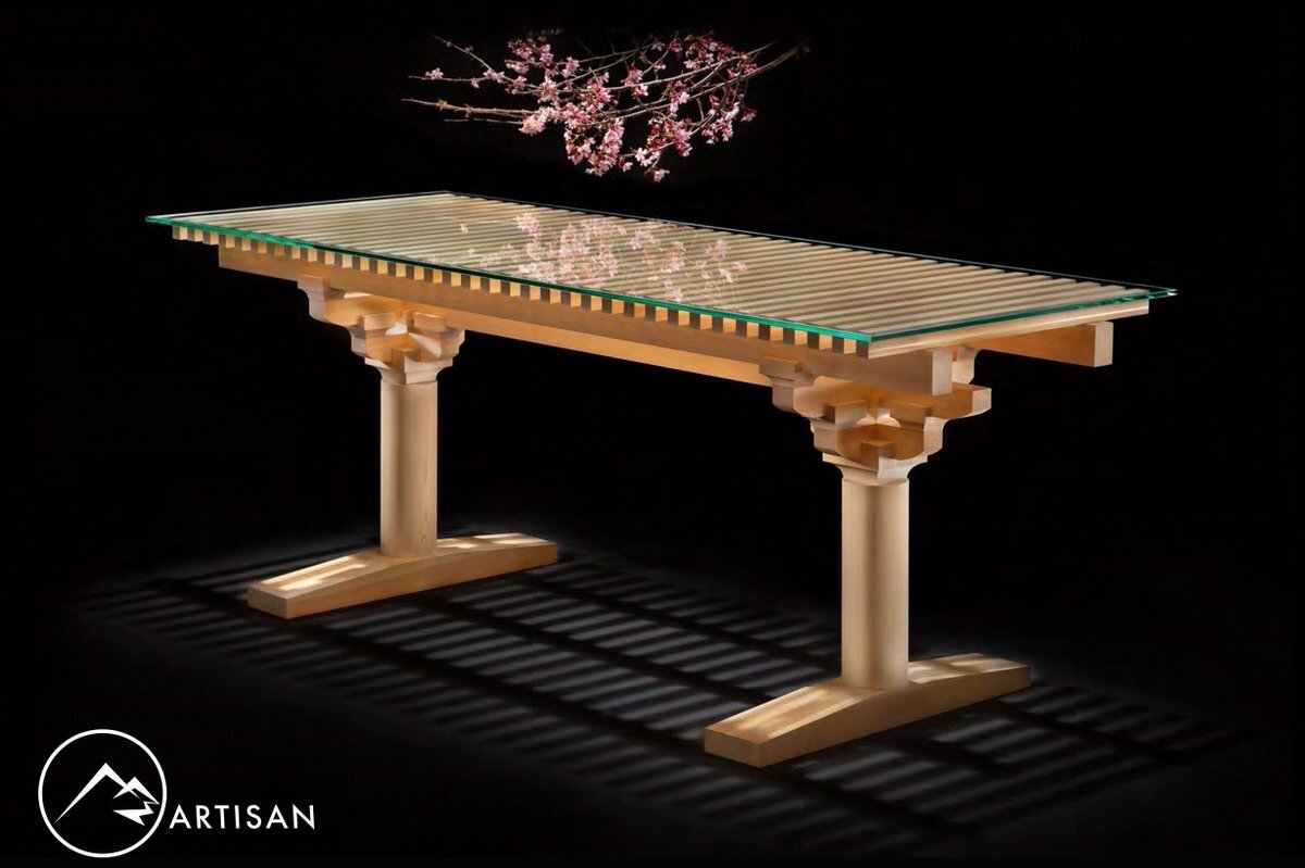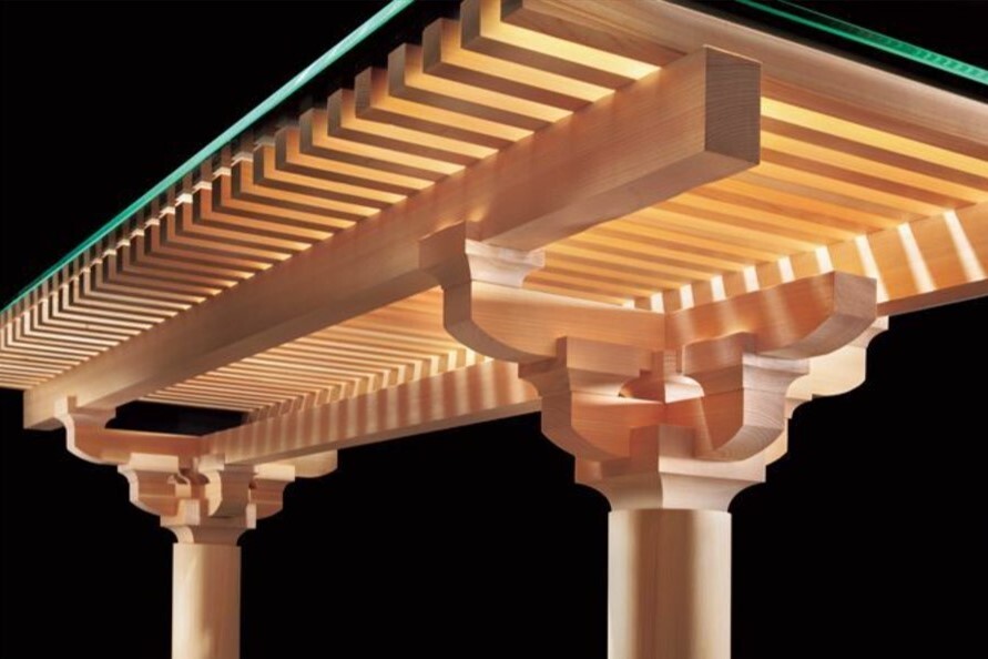 我が国の #伝統建築 は深い軒の出が特徴ですが、重い瓦や #垂木 を支えるため、柱より外に出た軒桁を支える #斗栱 という部位があります。6本分の垂木を支える #六枝掛 という技術を用いたテーブルが紹介されました。これがあれば毎日室内で伝統構法を愛でることができます! kobe-nagasawa.co.jp/officelayout/p… pic.x.com/EvPKCHMw0N x.com/rinyajapan/sta…
