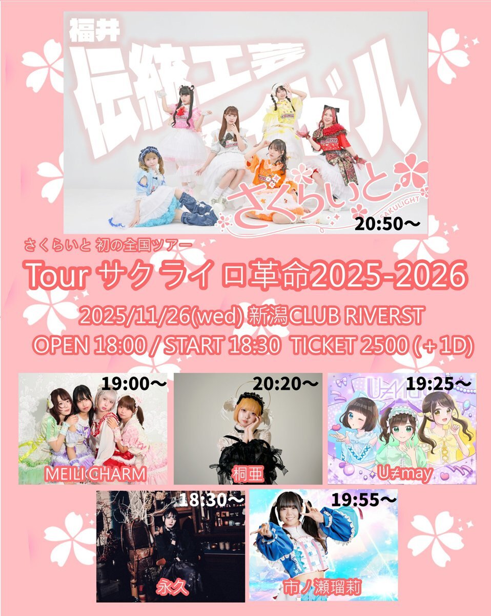 🌸明日の #さくらいと は🌸 新潟初登場🎉 平日ではありますが、一人でも多くの方に新潟デビューステージを目撃していただければ嬉しいです❤️🔥 Tour サクライロ革命2025-2026【第9旗】in新潟 ▶出演メンバー 護國まい、神楽ひより、朝日奈花子、陽向芽衣、琴月あゆ 『Tour