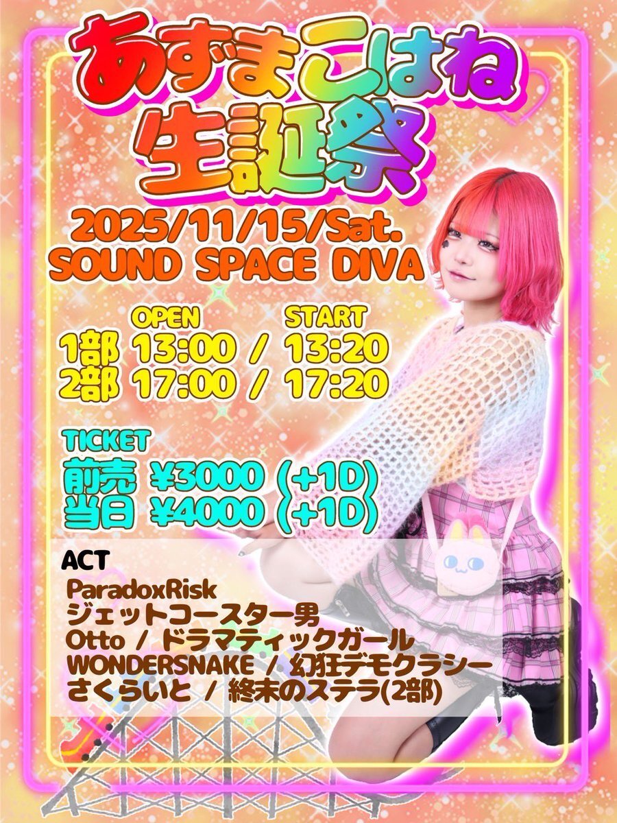 🌸タイムテーブル発表‼️🌸 Tour サクライロ革命2025-2026【第7旗】in名古屋 ▶参加メンバー フルメンバー 『ParadoxRisk あずまこはね生誕祭』 🗓️日程:11/15(土) 🎪会場:愛知 名古屋SOUNDSPACEDIVA ⏰時間:1部 開場13:00 開演13:20 /2部 開場17:00 開演17:20
