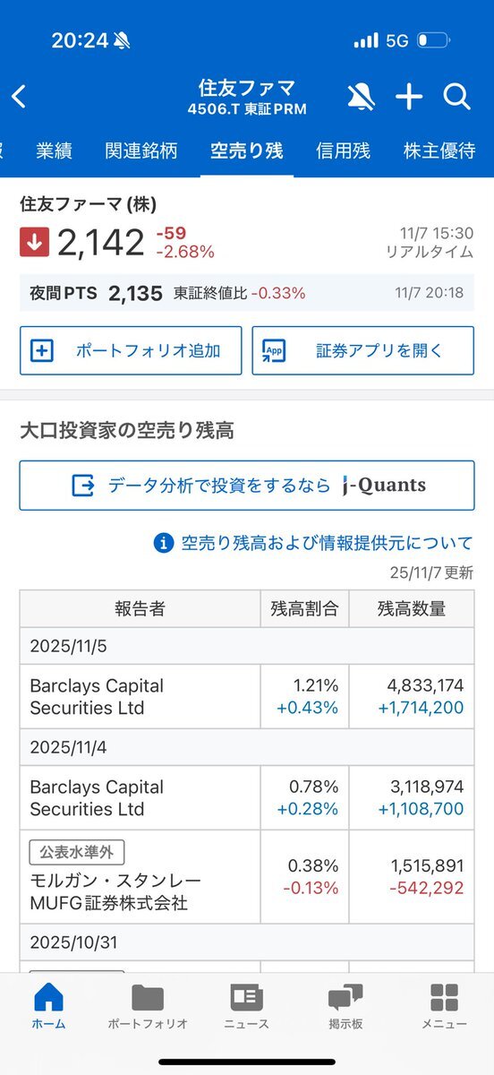 11月7日 週末だし仕方ないと思おう。 バークレイズ正気なのか? 買い戻ししてると思ったら170万株さらに空売り増やしてる! いつ買い戻しする気だろ ぶち上げて焼かれて欲しい笑 #株 #住友ファーマ pic.x.com/mfXOyslv8g
