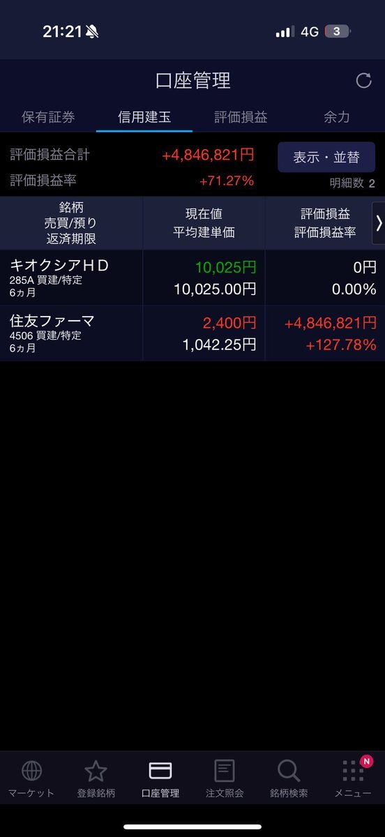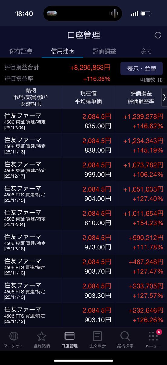 11月13日 信用期日到来により、5枚利確、6枚現引。 保有は6900株になった。 [内訳] 現物3300株 信用3600株 機関の買い戻し入ったかな。 あと値頃感で空売りしてる個人もちょこちょこ焼かれてる気がする。 #株 #住友ファーマ pic.x.com/gqv8C8fZcE