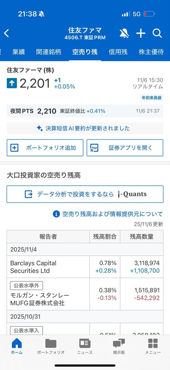 11月6日 静観。 バークレイズ決算日の翌日に100万株以上空売り入れてるんだよな。 昨日今日でいくらか精算してるだろうけど、まだなら一気に↑きそう #住友ファーマ #バイオ #株 pic.x.com/1qhENBOf8Q