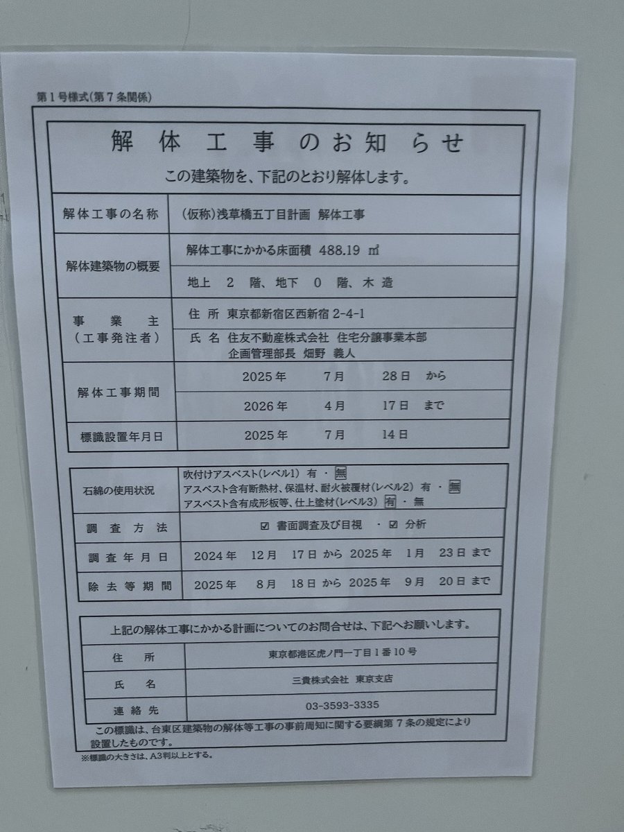 浅草橋の清洲橋通を1本東側に入ったところにすみふの解体お知らせ看板 周りの接道見るとタワーは厳しそう 浅草橋6分秋葉原9分ぐらいの立地かな #住友不動産 #シティハウス #シティタワー pic.x.com/0O1hH4MnWS