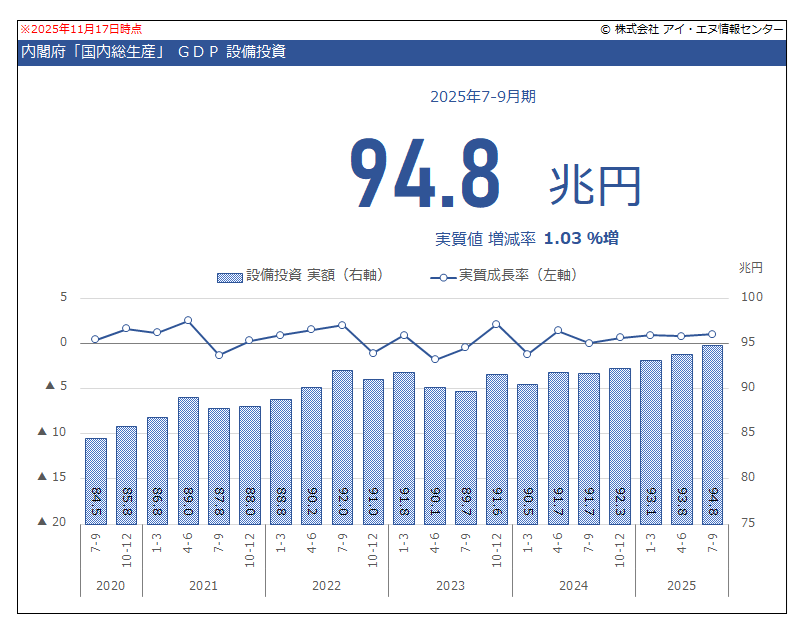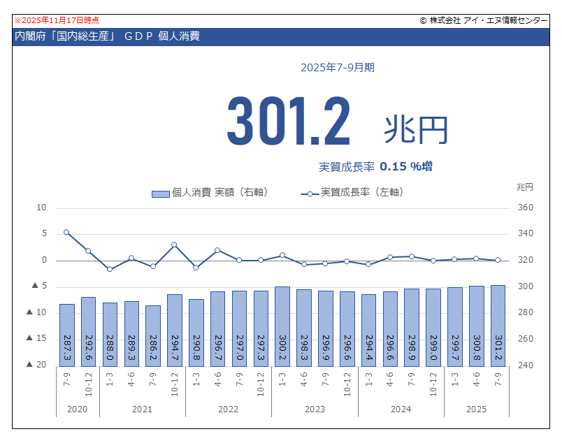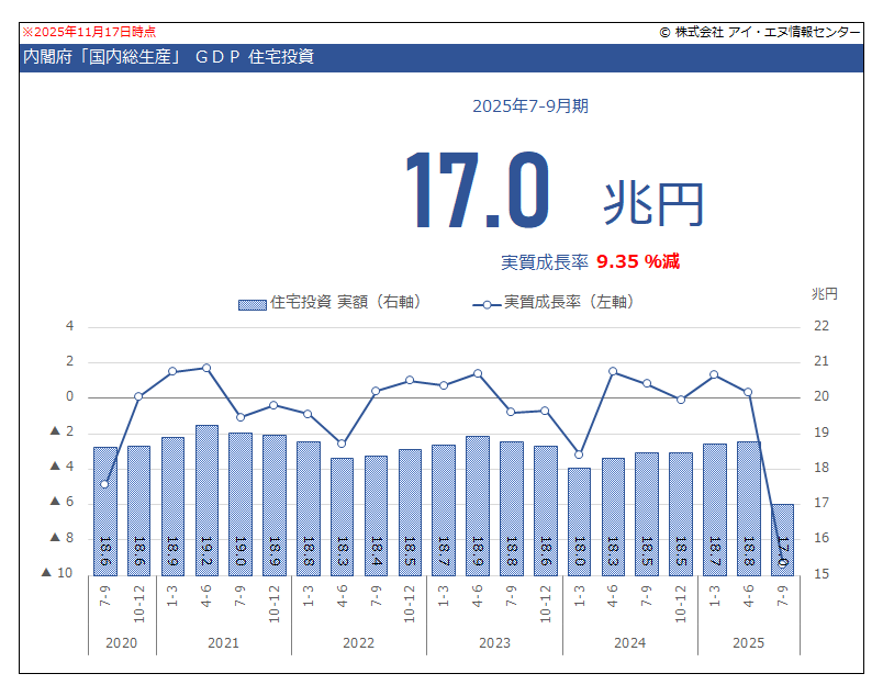 #国内総生産(内閣府)2025年7-9月期データが公表されました。#実質経済成長率 は #年率換算 1.8%減でした。実額では前期から 0.4%減。 #個人消費 は実質成長率 0.15%増、#住宅投資 は 9.35%減、#設備投資 は 1.03%増でした。 pic.x.com/WptOLC8flH x.com/indbgraphrepor…
