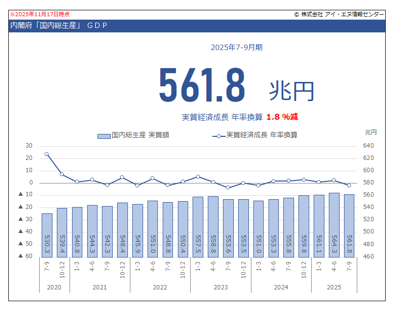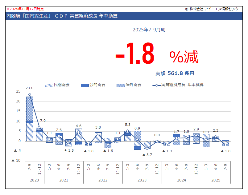 #国内総生産(内閣府)2025年7-9月期データが公表されました。実質経済成長率は年率換算 1.8%減でした。 国内総生産は、一定期間内に国内で生み出された商品やサービスの販売額から原材料費などのコストを差し引いた金額の総額。経済活動の活発さから経済力や景気の良し悪しを判断する重要な指標。