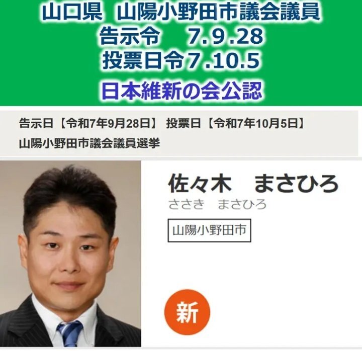 2025年10月5日投票日の山陽小野田市議会議員選挙「佐々木まさひろ」さんが、日本維新の会公認候補予定者として決定しました。 組織なく議員もいない山口県で維新の旗を共に掲げてくれる仲間です!! #日本維新の会 #山陽小野田市 #一周まわって維新 #山口3区 #佐々木まさひろ pic.x.com/ZB1fJ0jvKk