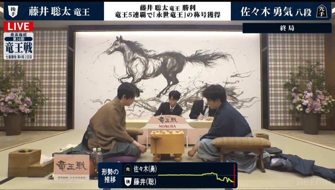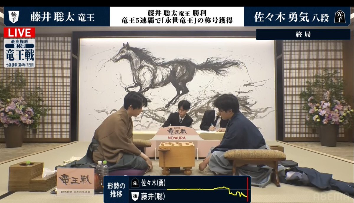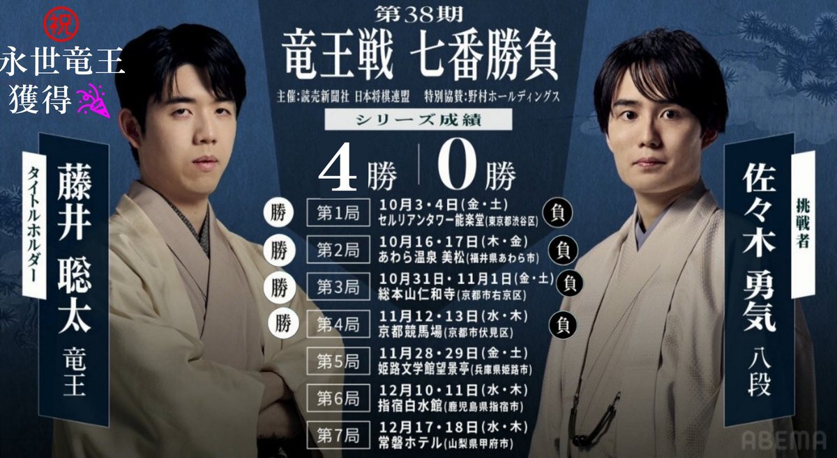 第38期 #竜王戦 は、 4勝0敗で、藤井聡太竜王 が防衛しました。 連続5期の規定により、 #永世竜王 の資格を獲得しました。 #藤井聡太竜王おめでとうございます。 #佐々木勇気八段 お疲れ様でした。 pic.x.com/yESP3VSUup