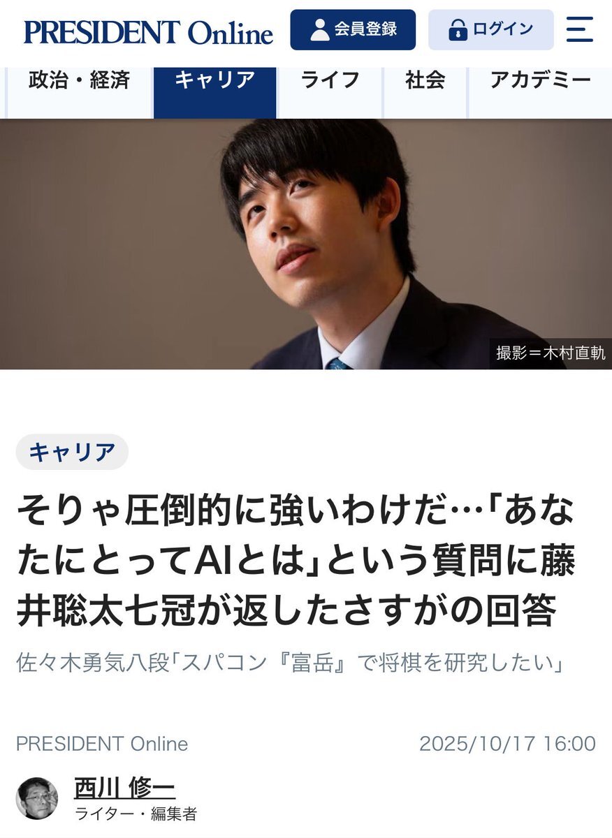 #藤井聡太竜王 と #佐々木勇気八段 にAIとの向き合い方を聞く。 president.jp/articles/-/103… 「いくら事前に研究していても、絶対にどこかで未知の局面になります。一番重要なのはその局面でどう考え、どう対応するか。その力をつけるためにAIを使うということを意識しています」 #竜王戦 #永世竜王 pic.x.com/AQPkcfplJk