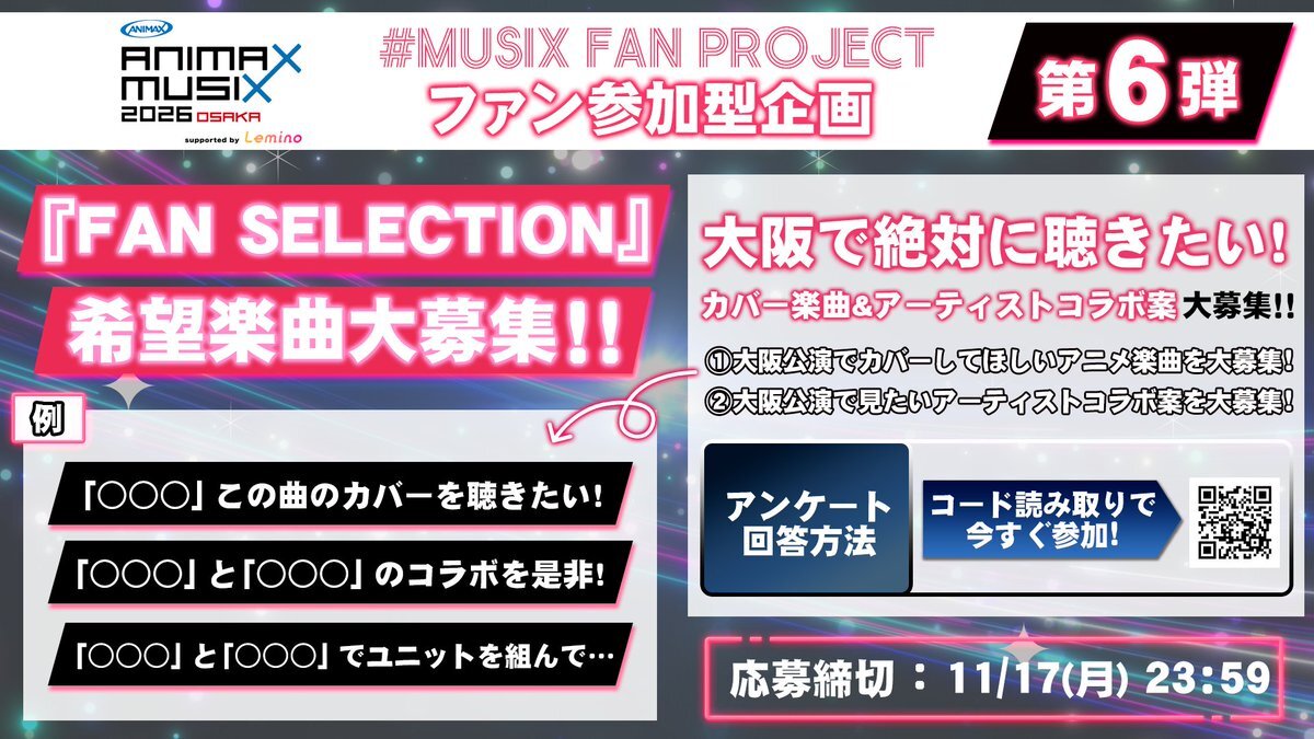 / 📢 #MUSIXFANPROJECT ファン参加型企画:第6弾🎉 \ ■ 【FAN SELECTION】 🎤① 聴きたいカバー楽曲を大募集! ✨② 観て聴きたい!アーティストコラボ案を大募集! ※大阪公演に関する募集となります 🗓️応募締切 11月17日 (月) 23:59 まで 応募はこちら🔽 ▶forms.gle/Ayq9oCmVA1GMB4…