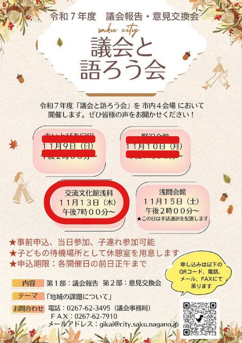 私は明日11/9(日)のあいとぴあ臼田の回を担当します!ぜひお越し下さい✨ ちなみに昨年は1回のみ、佐久市議会の議会棟で開催していましたが、新議長の清水議員のもと、町に出る議会になろうと今年は各地で計4回の開催としました! #佐久市議会 #議会と語ろう会