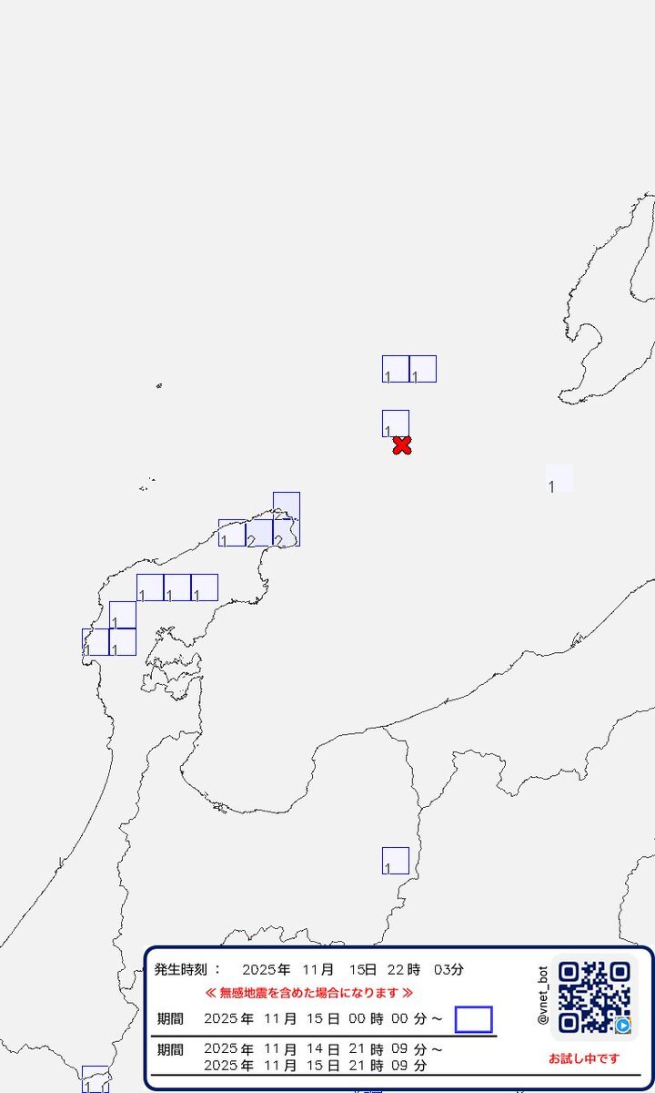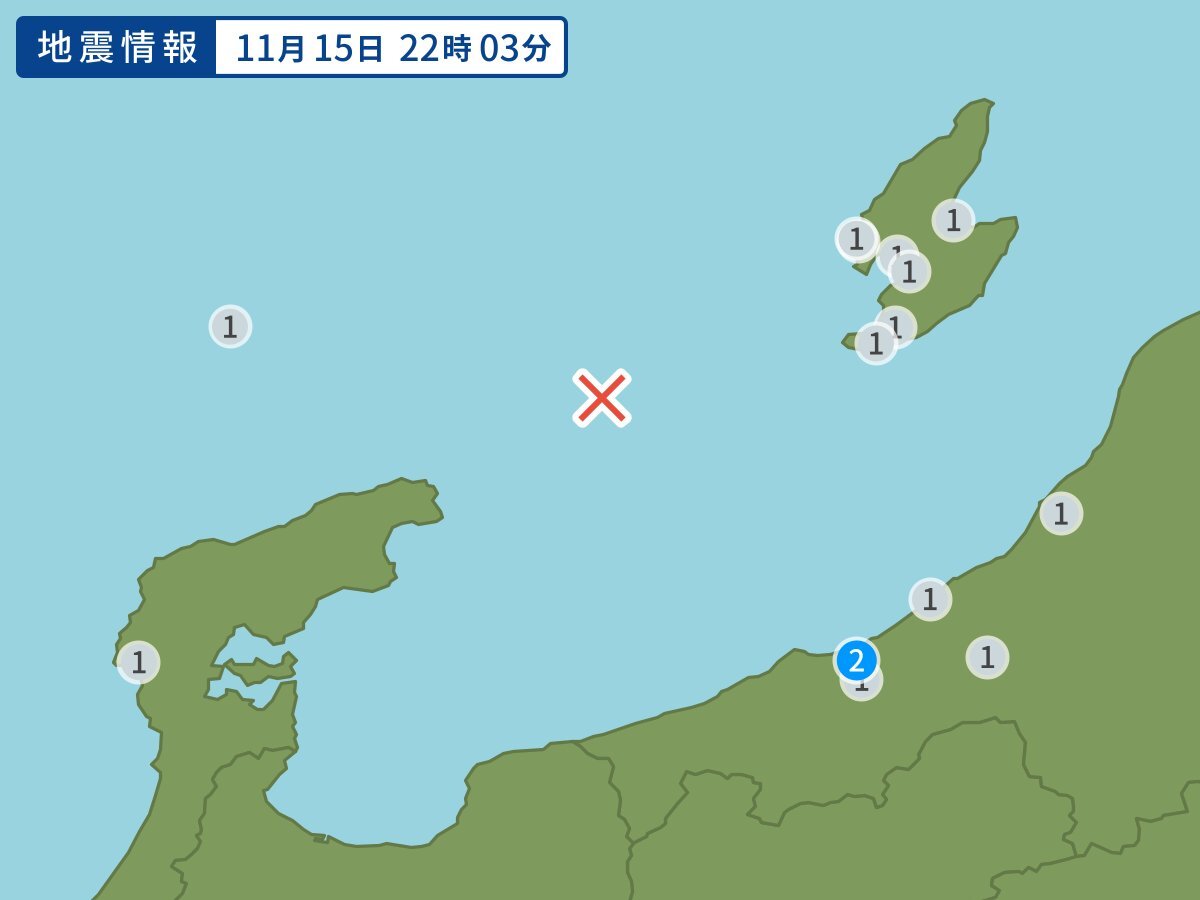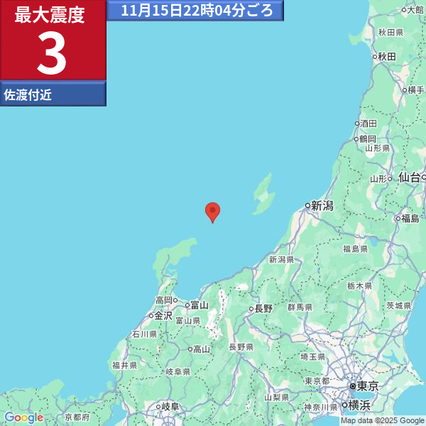 【緊急地震速報(予報)】佐渡付近震度3の地震 発生時刻:11月15日22時04分頃 震央情報:佐渡付近 最大震度:3 マグニチュード:M4.0 深さ:20 km #佐渡付近 #震度3 地震びっくり 地震大丈夫? 地震どうだった? 予報のため誤差あり(42) pic.x.com/r7U9PprjBf