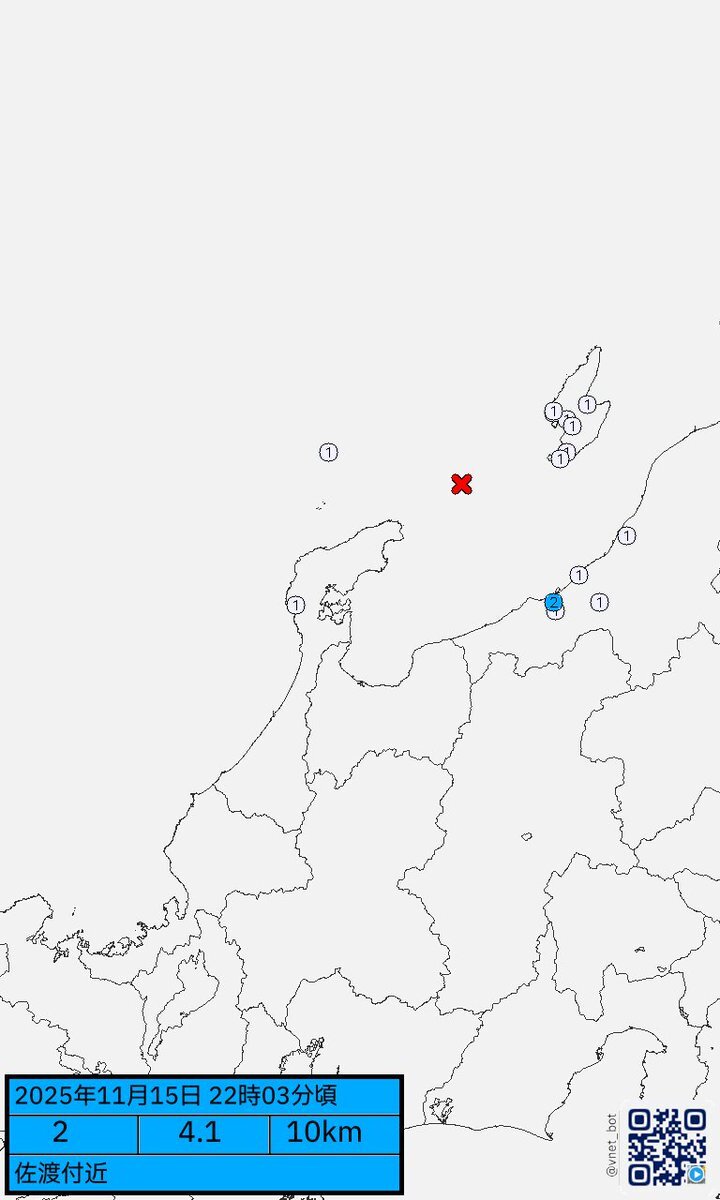2025年11月15日 22時03分頃 佐渡付近 最大震度:2 マグニチュード:4.1 深さ:10km 🔗 jma.go.jp/bosai/map.html… 🔗 data.jma.go.jp/multi/quake/qu… 停①) #地震情報 #地震 #佐渡付近
