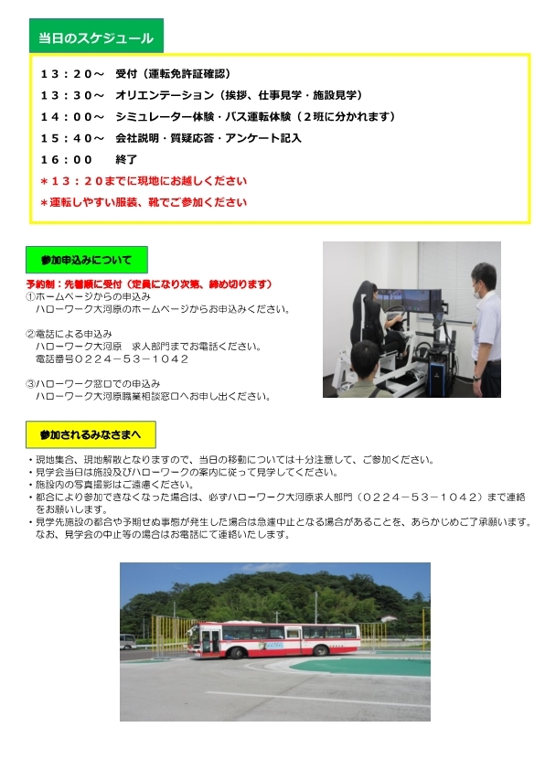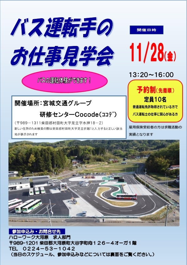 ✨✨『バス運転手のお仕事見学会』✨✨ バスの運転体験ができます 日時:令和7年11月28日(金) 13:20~16:00 会場:宮城交通グループ 研修センターCocode (現地集合・現地解散) お申込みはハローワーク大河原まで😊 詳細はこちら👇 #事業所見学会 #体験会 #ハローワーク大河原 pic.x.com/nnCb8z1JGr