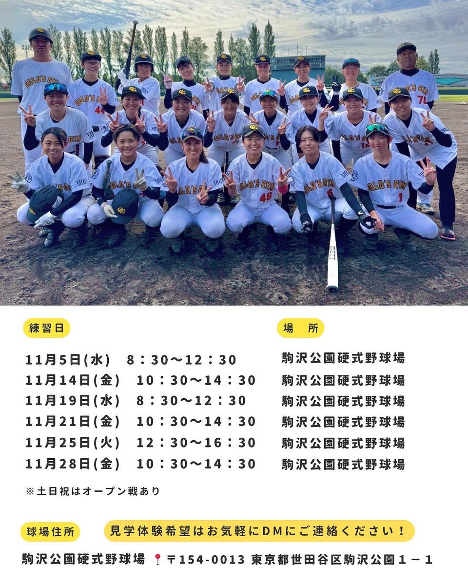 投稿遅くなり申し訳ございません🙇 【11月練習体験会のお知らせ🗣️‼️】 DMよりご連絡お待ちしております😚 野球経験者、未経験者、ブランクがある方も大歓迎‼️ 野球が好き!野球がやりたい!その熱い想いだけで充分です❤️🔥 お気軽にご連絡ください🫡 #ゴールドジム #拡がれ女子野球 #体験会 pic.x.com/il0x4fjP5C