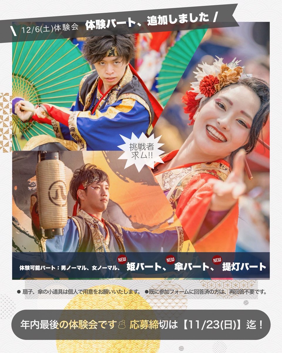 12/6(土)の体験会では、 男・女パートに加えて『姫・傘・提灯』パートも 体験可能です🪭☂🏮✨️ 参加希望の方は 11/23(日) までにご応募ください! ※扇子や傘は各自でご用意をお願いします。 #kagura #体験会 #メンバー募集 pic.x.com/WnW7gvZvaw x.com/kagura_nagoya/…