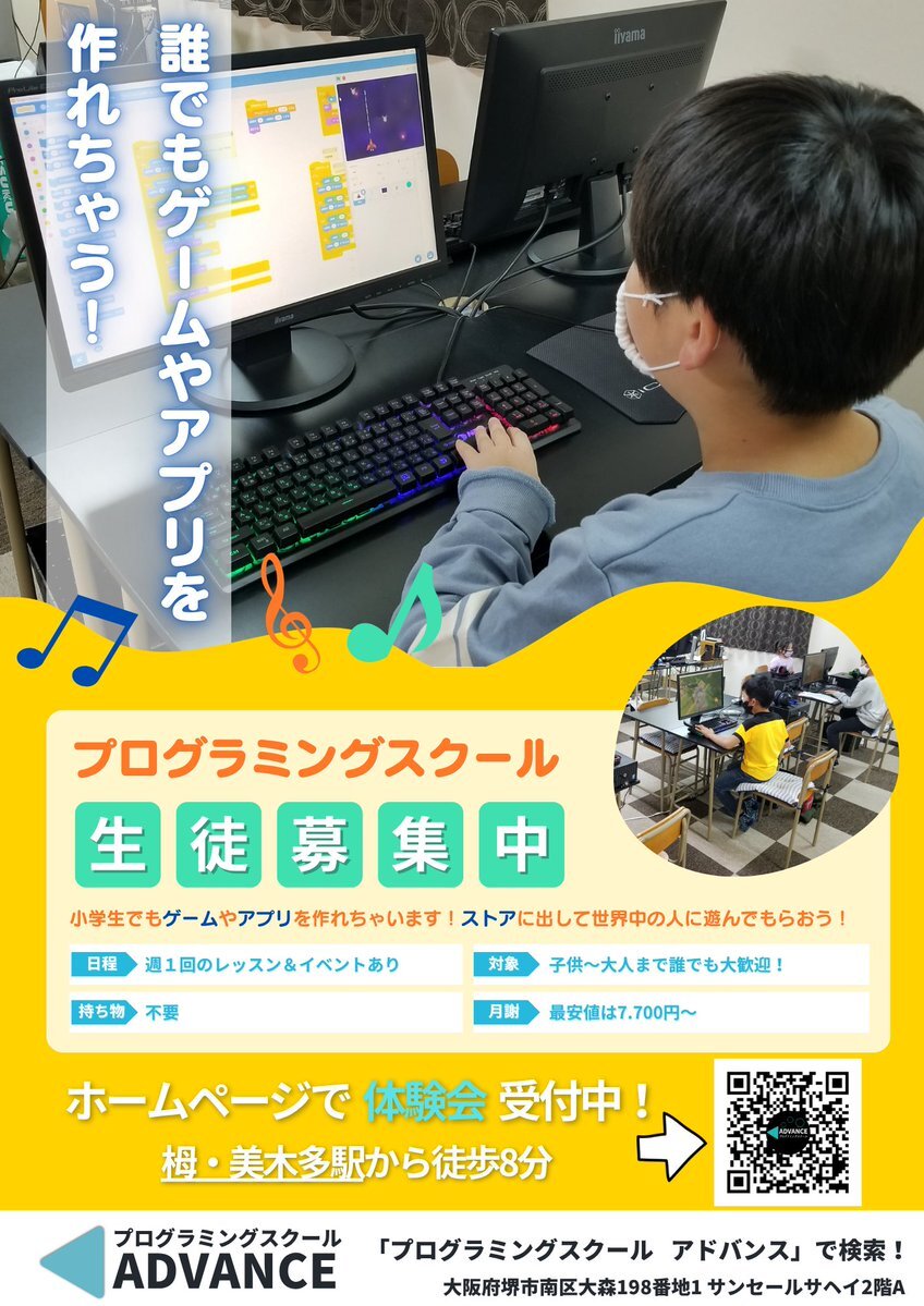 ゲームやアプリを作りながら、楽しくプログラミングを学ぼう!✨ 子供~大人まで、やさしく・わかりやすく・楽しく教えます🤩 「できた!」の笑顔があふれる教室です😊 🌐 詳しくはこちら programming-school-advance.com 無料の体験会実施中! #プログラミング #習い事 #ADVANCE #ゲーム作り #堺市