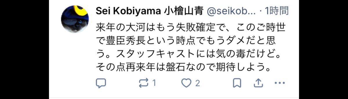 まだ見てもいない来年は失敗、再来年は成功って言い切っているけど、今年の大河にしても開始前から絶賛したらフェミ仲間が叩いて、彼らと縁を切る事態になり、しかも現在の物語展開が気に入らなくなってから急に陰謀論を持ち出してヘイトして、そういう予見は結果的に墓穴を掘らない? #何かを見た pic.x.com/OTzqk4zDmF