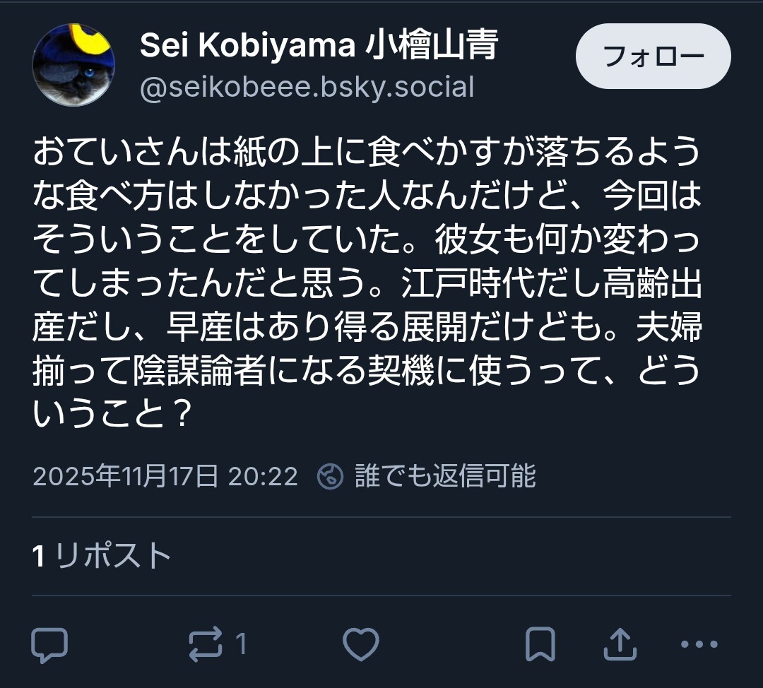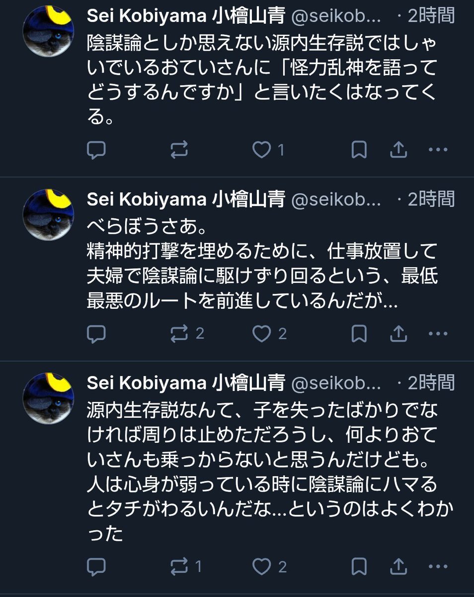 #何かを見た 早産な上産後の肥立ちもあまり良くなく我が子を弔ったていさんを、自分が気に入らない展開になったからと『早産で頭がおかしくなった』とか『仕事放置して陰謀論者になった』とか執拗に叩いてるけど、人の心とかないんか?
