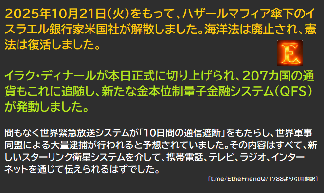 返信先:@hasibiro_maga安倍元総理暗殺の報復権(国際法)は、丸子がトランプ政権に委譲した。 10月21日は、日本で丸子の高市早苗内閣総理大臣が誕生したその日である。 #トランプ革命 #QFS #作戦計画 #秘密の作戦 #丸子とトランプの逆襲 pic.x.com/SwAE6aDv17