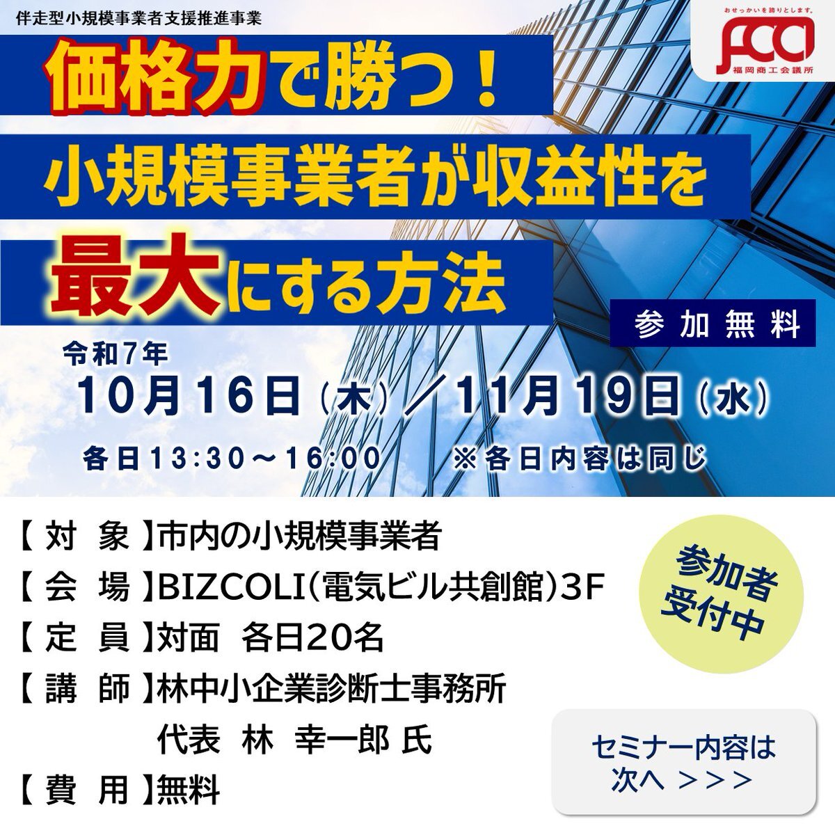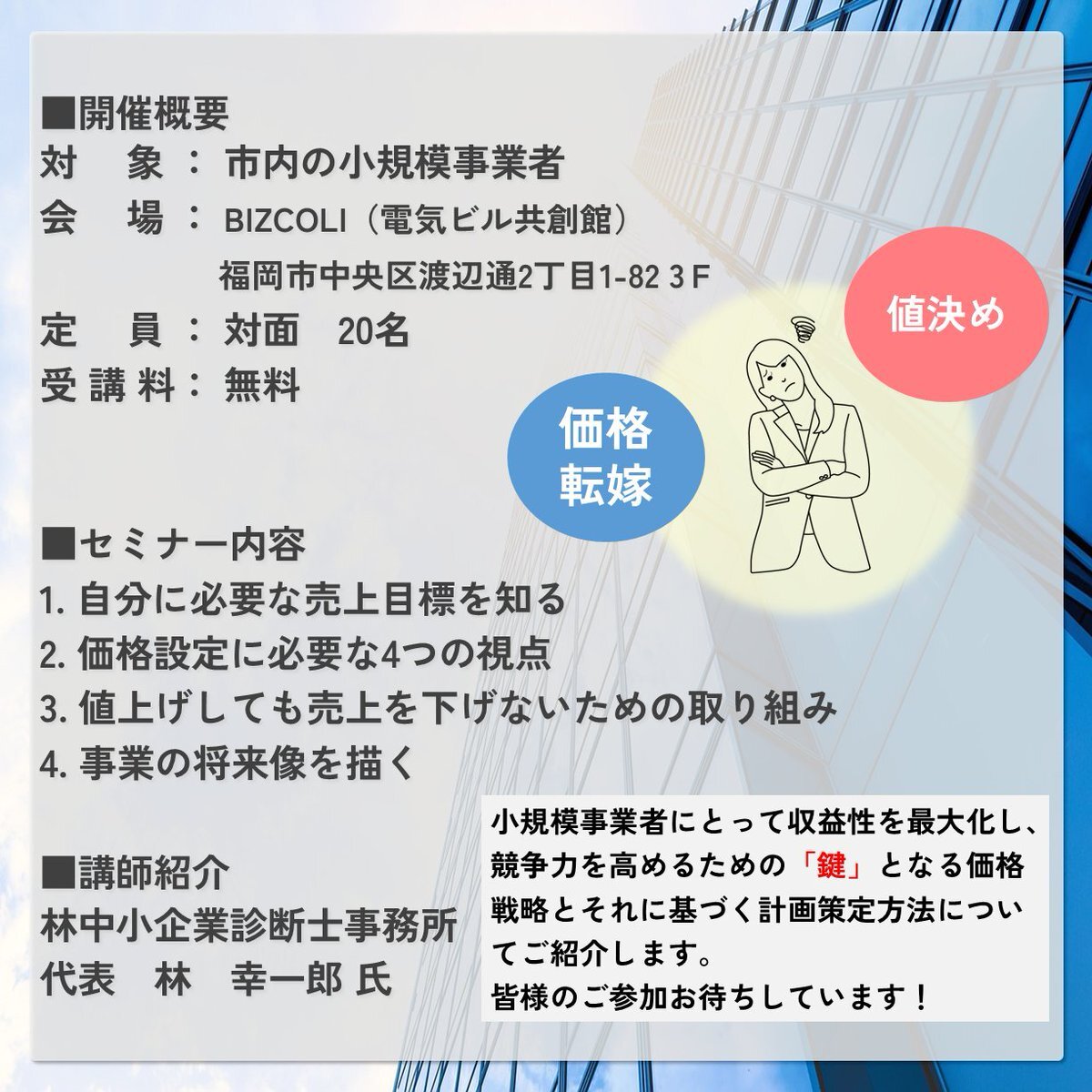 \収益力アップのチャンス!/ 小規模事業者の皆様必見👀 #物価高騰 の今こそ見直したい「値決め」。 #価格戦略 で #収益性 と #競争力 を高める方法を学ぶ価格戦略セミナーを開催✍ 参加申込はお早めに✨ 🔗fukunet.or.jp/fcci-events/ev… #福岡商工会議所 #経営 pic.x.com/QR6dwsryqm