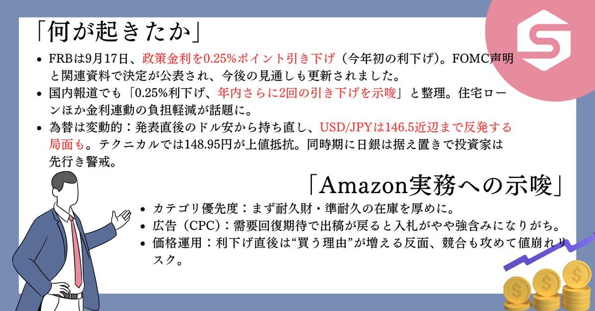 📈金利が下がって“ちょっといい物”が動きやすい時期 🔍どのジャンルを推す?値付けは?在庫は?——3分で読めるカンタン版まとめ👇 sellersprite.com/v3/knowledge/a… #FRB利下げ #Amazon物販 #EC運用 #プライム感謝祭 #ブラックフライデー #タイムセール #円安 #BNPL #在庫管理 #価格戦略 #広告運用 pic.x.com/HOLQT0uSNC