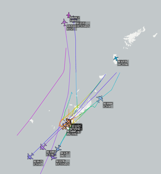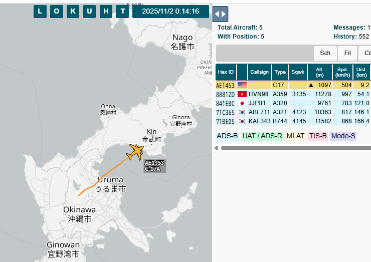 2025/11/4 21:55:59~7:34:02にここで取れた軍用機 グレーの人とC-17のうち一匹は除外して 深夜早朝11匹 #OHアラート