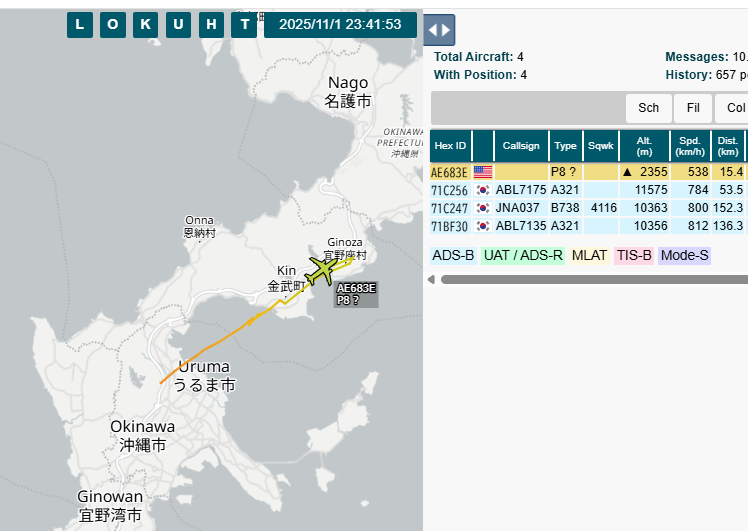 2025/10/28 21:56:01~7:34:00にここで取れた軍用機 通過がAE0679、AE10B7、8A09E2、C87F00の四匹で7時以降離陸が二匹なので 深夜早朝十匹 #OHアラート