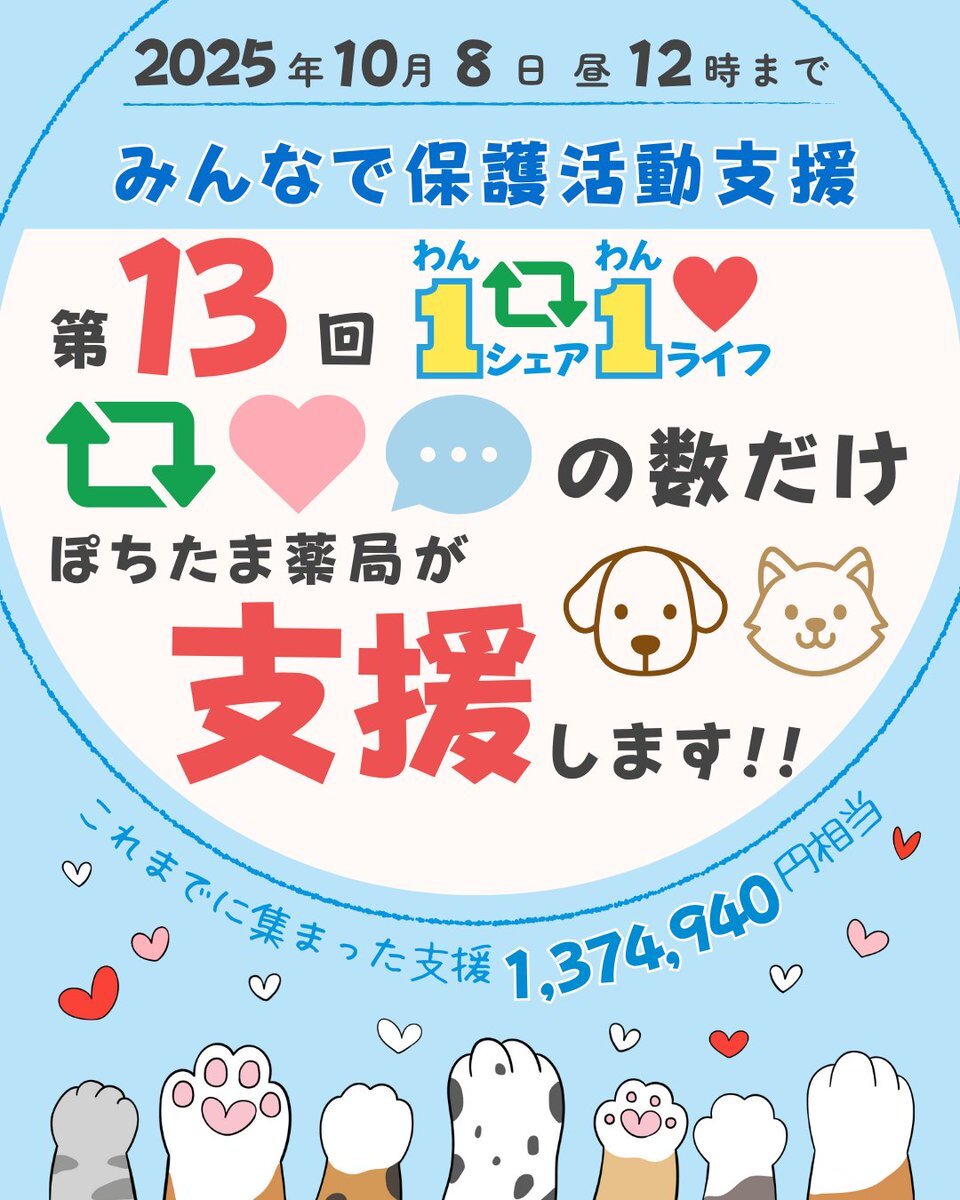 第13回「1シェア1ライフ」 この投稿に寄せられた応援(♻️❤️💬)をポイントに換算し、 【ぽちたま保護犬猫支援プログラム】参加団体の皆さまへ公平に分配いたします。 ぽちたま薬局が、皆さまの応援を "支援" に変えます。