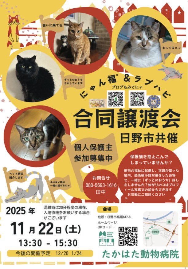 【譲渡会】 11月22日(土)たかはた動物病院にて にゃん福°さんと一緒に譲渡会をさせて頂きます! 可愛い猫さん達が待っています😻 皆さん、いらして下さいね🧡 ねこちゃんと家族になるためにをご覧になって下さい youtu.be/FS0XaWtXiYo?si… #譲渡会 #高幡不動駅 #たかはた動物病院 #保護猫を迎える pic.x.com/465LxlCcaW