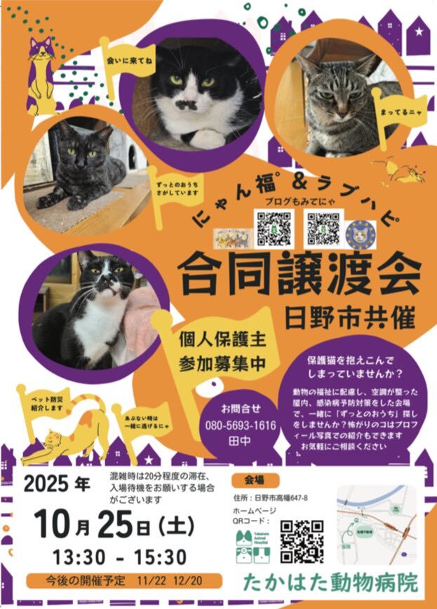 【譲渡会】 10月25日(土)たかはた動物病院にて にゃん福°さんと一緒に譲渡会をさせて頂きます! 可愛い猫さん達が待っています😻 皆さん、いらして下さいね🧡 ねこちゃんと家族になるためにをご覧になって下さい #譲渡会 #高幡不動駅 #たかはた動物病院 #保護猫を迎える x.com/love_haapy_cat…