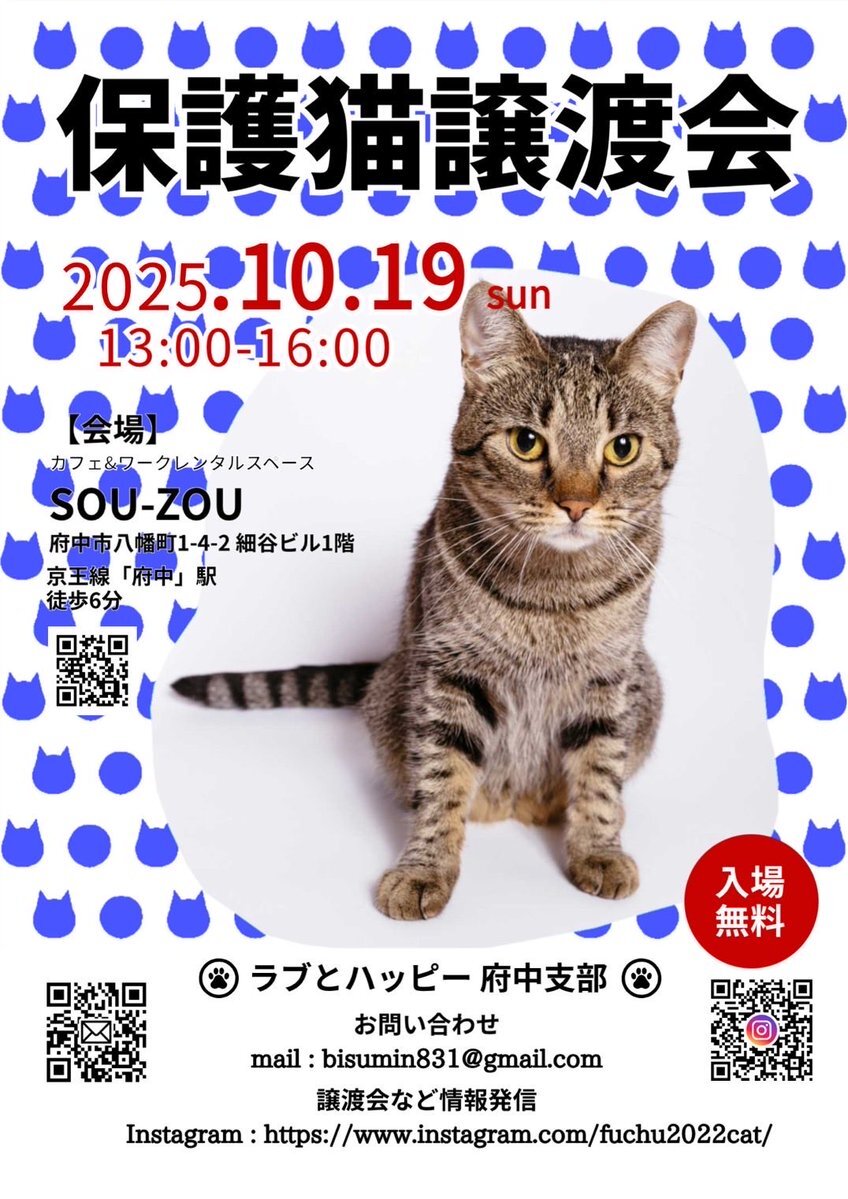 【譲渡会】 府中支部の譲渡会に程久保ラブハピも参加いたします🙇‍♀️ 日時:2025年10月19日(日) 13:00〜16:00 会場:カフェsou-zou 府中市八幡町1-4-2細谷ビル1階 sou-zou.jp メンバー決まりました🙌 #譲渡会 #府中駅 #里親大募集中 #保護猫と暮らす #保護猫 #SOUZOU