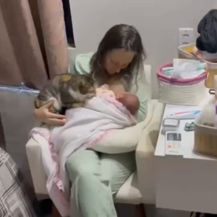 ママさんが病院で出産し新生児を連れて家に帰って来てから、ママと赤ちゃんのそばを離れず、慈しむように見守る猫さん