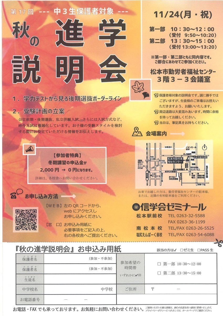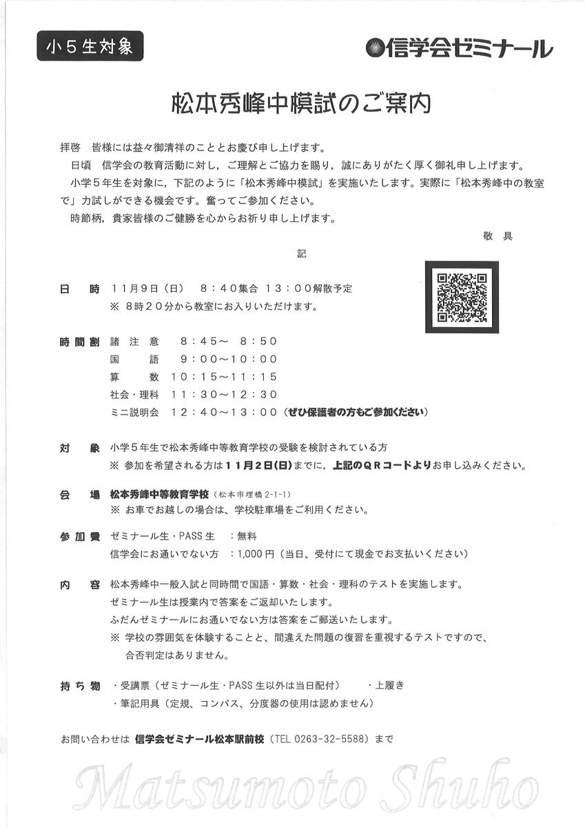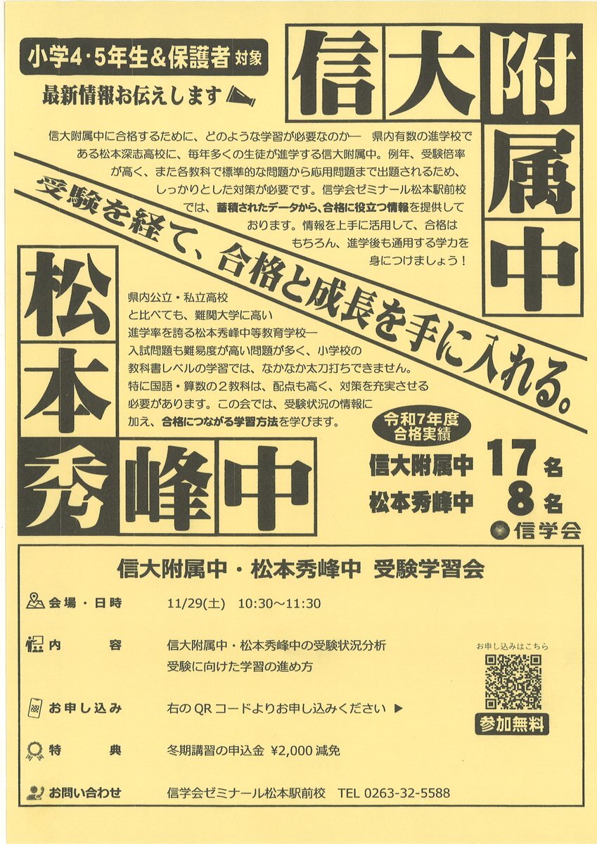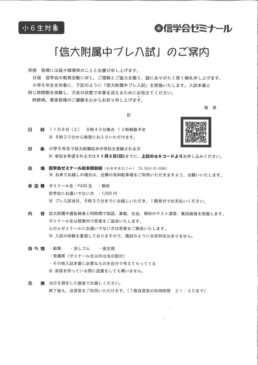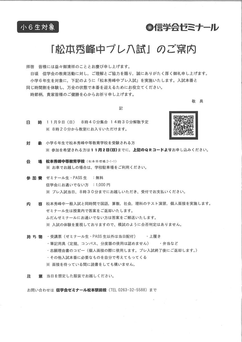 小6生を対象に「松本秀峰中プレ入試」を実施いたします。 しかも実施会場は「松本秀峰中等教育学校」! 詳細はチラシをご覧ください。 お申込はコチラから shinshu-matsumoto.shingakukai.ac.jp/event #信学会 #予備校 #塾 #中学受験 #中学入試 #松本秀峰中等教育学校 #信予備 #信ヨビ #ゼミナール #松本駅前校 #模試 pic.x.com/2WaO0EwVgw
