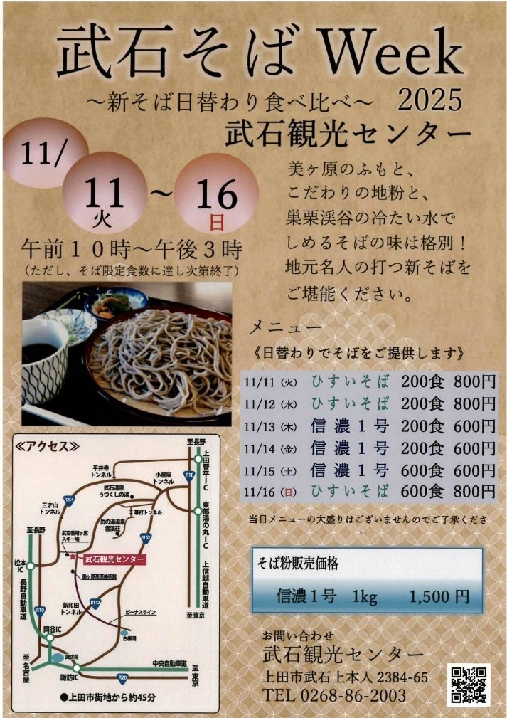 長野県上田市武石観光センター 【#武石新そばウィーク】🍃 11月11日(火)~16日(日) @武石観光センター 地元・武石産の香り高い手打ち新そばが堪能できます✨ 秋の味覚を楽しむなら今がチャンス!🌾 #上田市 #信州そば #新そば #長野グルメ #食のイベント maps.app.goo.gl/V3HH8A7VP6Ctie… pic.x.com/FgAftGSsGa