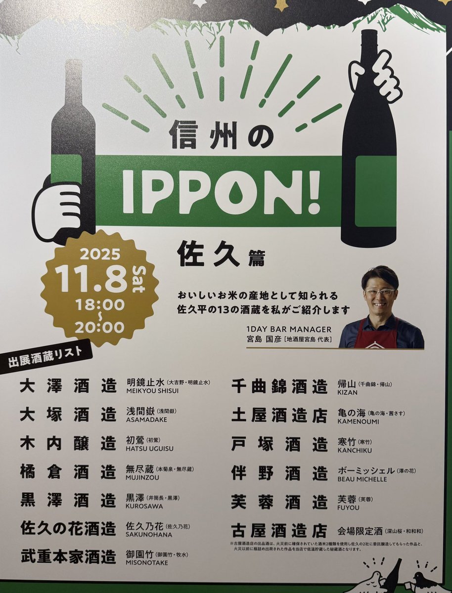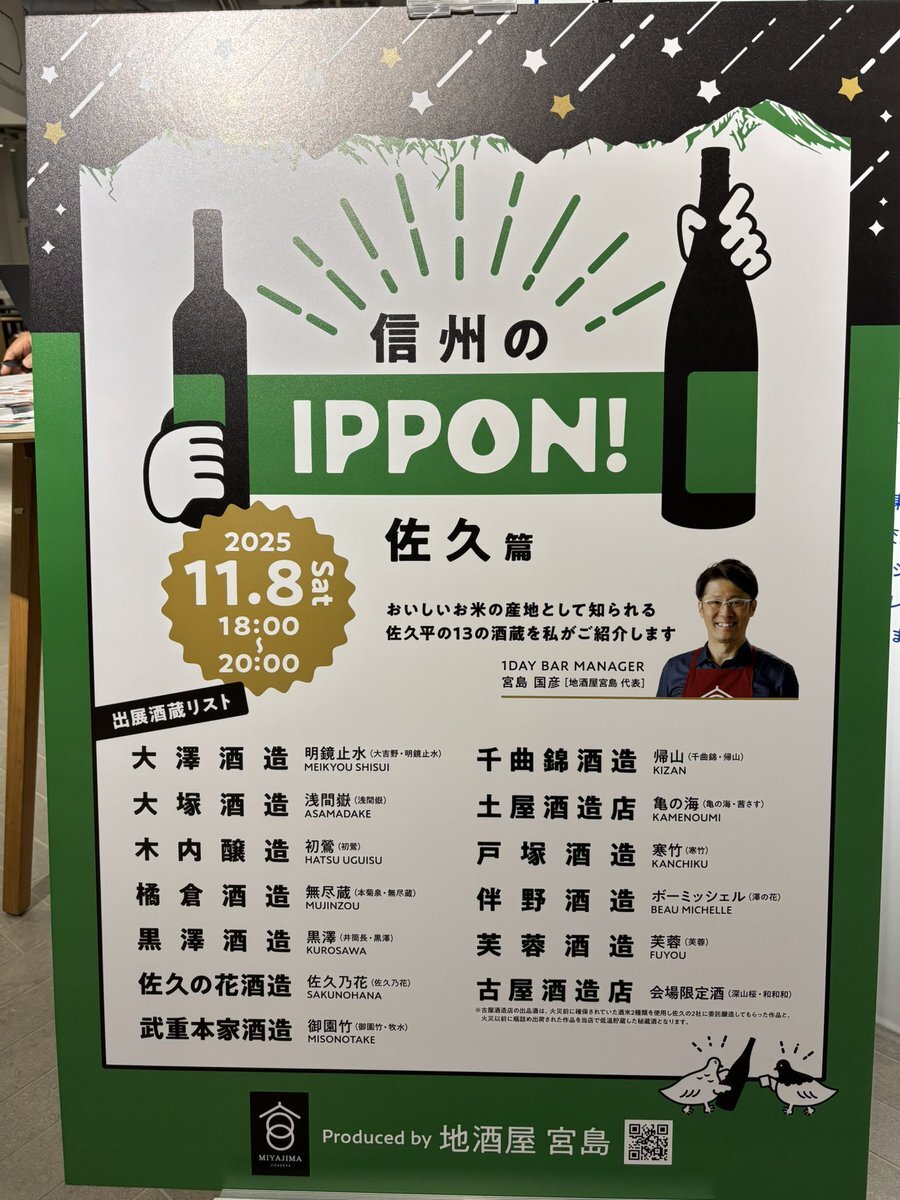 〈信州のIPPON! 佐久篇〉 11月8日(土)18:00-20:00 東京ミッドタウン八重洲(東京駅地下直結) 今年も地酒屋宮島監修の信州地酒イベント「信州のIPPON!」が、東京にやってきます!今年は「佐久篇」とし、佐久地域の13の酒蔵 “SAKU Thirteen” をご紹介。 チケットはこちらから shinshunoippon2025.peatix.com