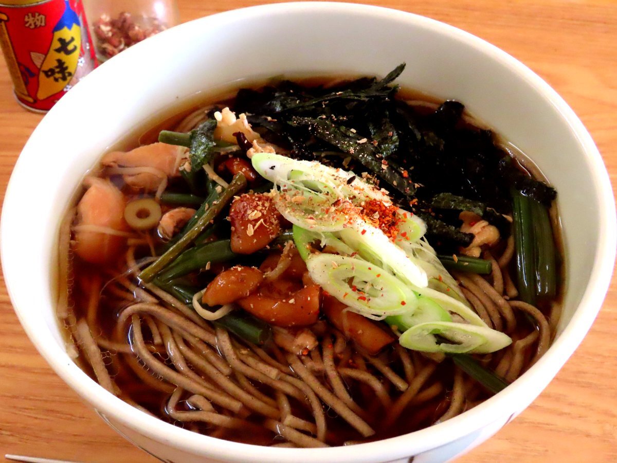 昼餉の一杯;"#山菜信太蕎麦"😁 水酒創味塩梅炙小揚山菜mix煮立片栗薄葛仕立😉 #挽きたて香る信州そば(熱掛)笹葱七味deぞぞぞ~!👍 揉海苔散らせば一層香ばし(゚д゚)ウマー❗️😅😂🤣 #昼メシ #山菜そば #山菜水煮 #しのだそば #油揚げ #創味のつゆ #乾麺 #干しそば #信州ほしの #星野物産 pic.x.com/LUuS59HJMe