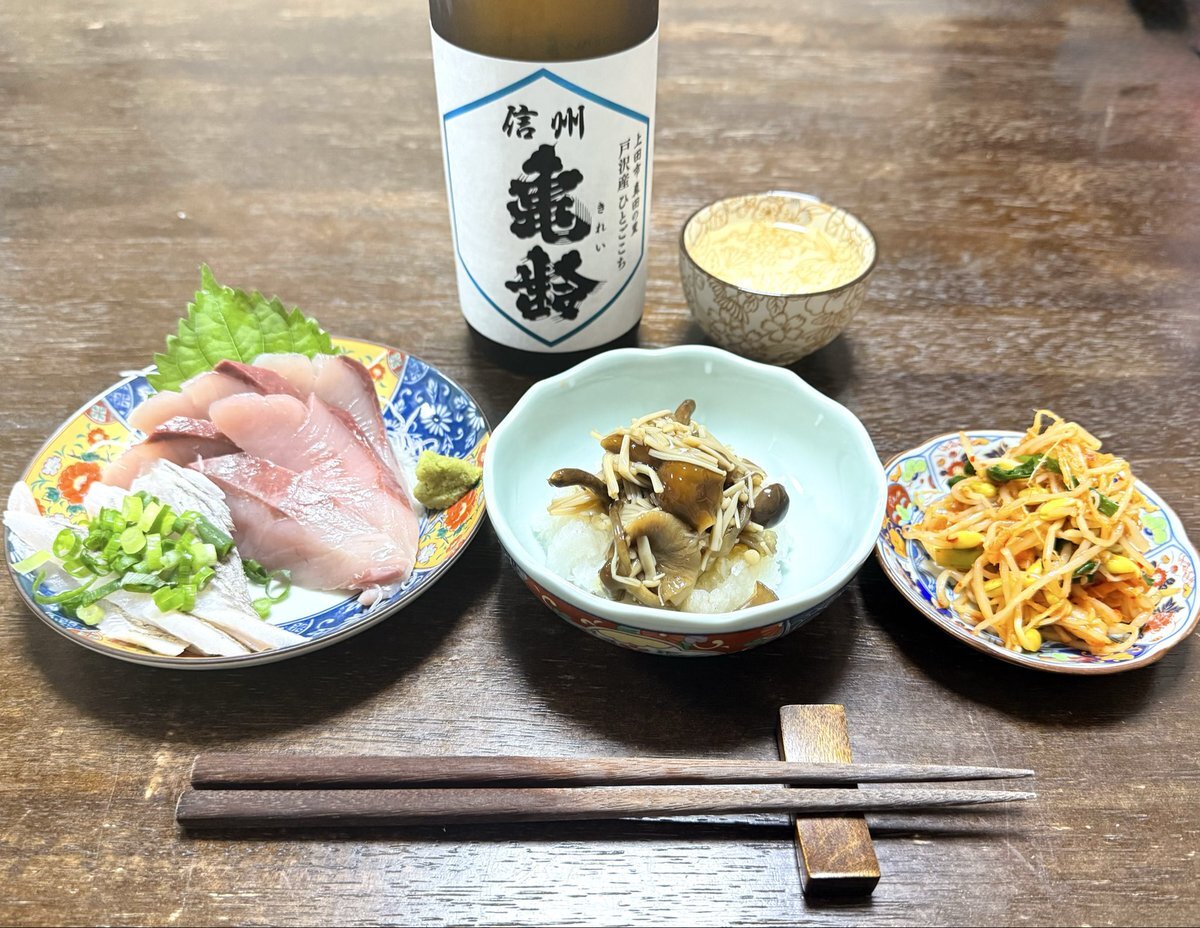 こんばんは🙌 🏮居酒屋Shige開店🏮 イナダと炙り太刀魚刺身 キノコおろし もやしキムチ 三連休の二日目は信州亀齢で乾杯ですよぉ〜🍶✨✨ 旨いっ😋 最高やねぇ〜🎶🎶 #信州亀齢 pic.x.com/mWNSrBN0EG