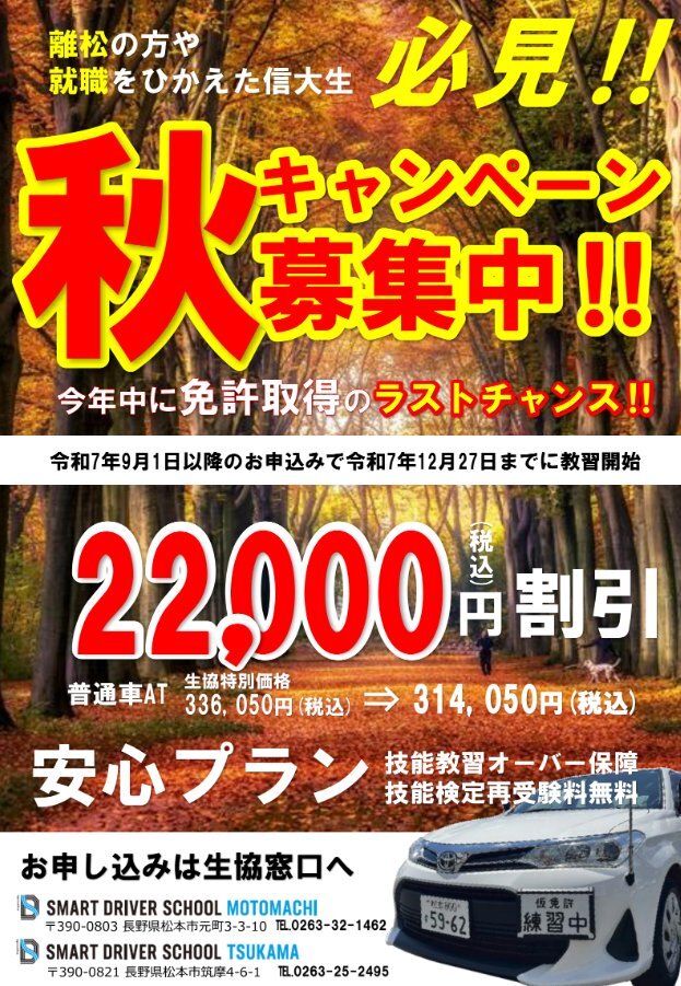 🤡学生バイトのぼやき🤡 メンキョトリタイ!!! もとまち校、つかま校で秋キャンペーンが開催中です!! 今年中に免許を取りたい方、今がチャンスです!! お申し込みは購買書籍部まで!! メンキョトリタイ!!!メンキョホシイ!!! #信州大学 #信大生協 #メンキョトリタイ #バイトのぼやき pic.x.com/IjpNgkRg3q