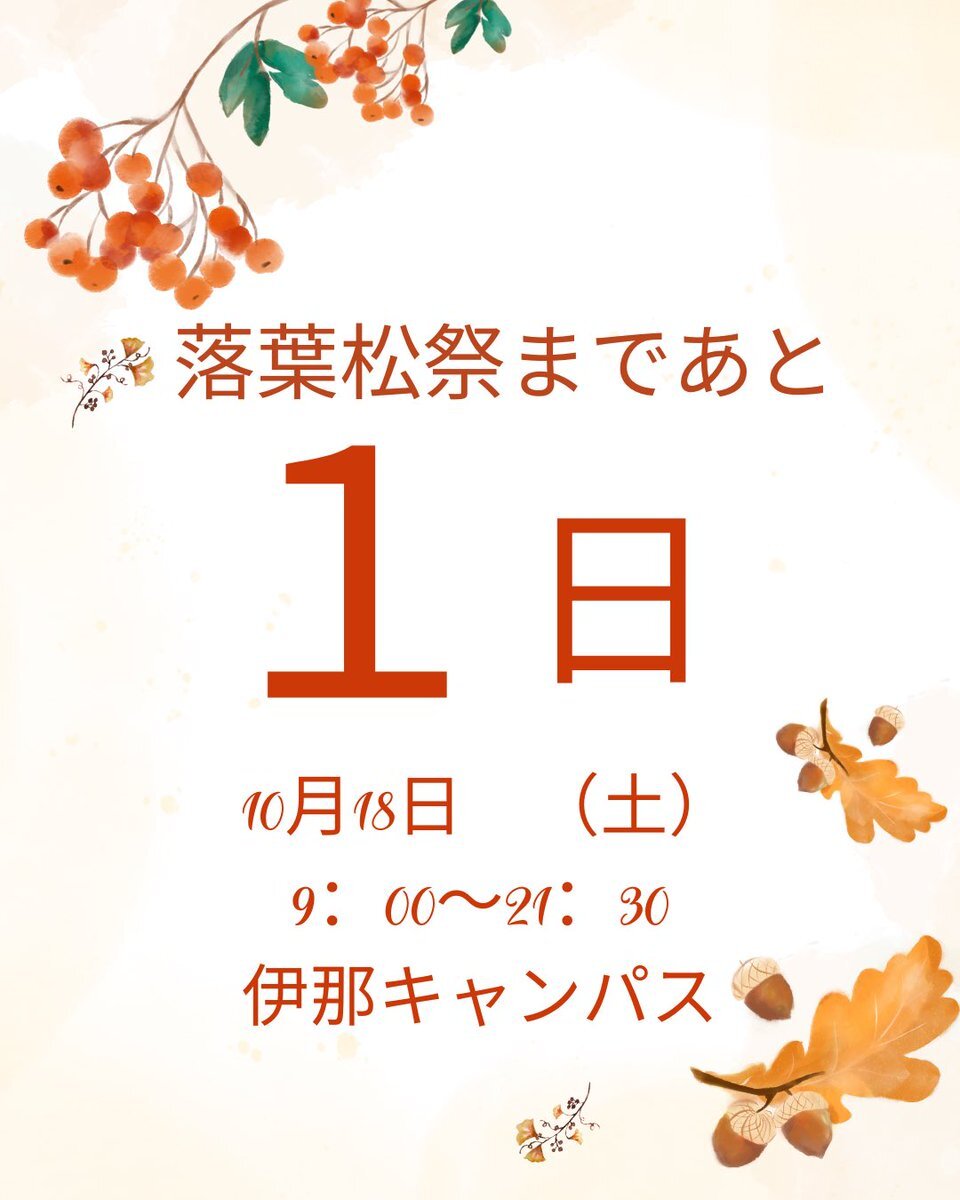 〜10/18(土)は落葉松祭です!〜 落葉松祭まで残り1日! 落葉松祭はいよいよ明日です。 当日は模擬店、展示、ステージ、そして体験イベント等盛りだくさんの一日となります。 お楽しみに! #落葉松祭 #信州大学 #信州大学農学部 pic.x.com/G2fORys197