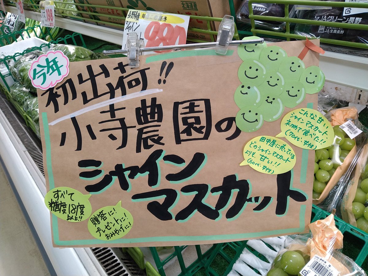 小寺農園のシャインマスカット、本日、「フレッシュトップ田中屋」に入荷いたしました。 本人が納得したものだけ納品するため、早い者勝ちになりますが、宜しくお願いいたします。 #信州新町 #小寺農園 #シャインマスカット #フレッシュトップ田中屋 pic.x.com/h5H4tsjp2A