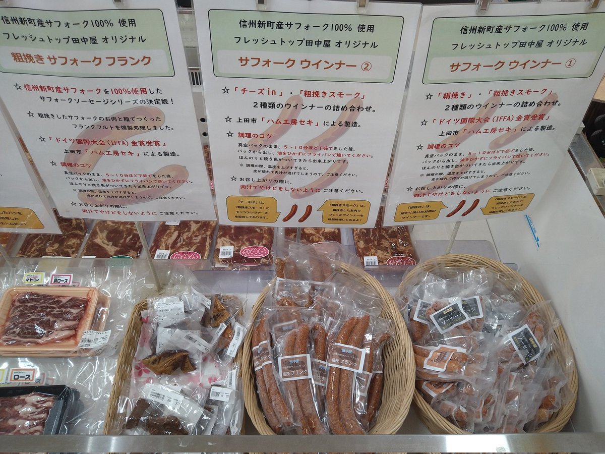 信州新町産サフォークの加工品、揃っています。 最近はフランクフルトがよく売れているようです。 ありがとうございます。 引き続き宜しくお願いいたします。 #信州新町 #信州新町産サフォーク #信州新町サフォーク #信州サフォーク #ハム工房セキ #フレッシュトップ田中屋 #信州新町羊同好会 pic.x.com/NABqZa6m58