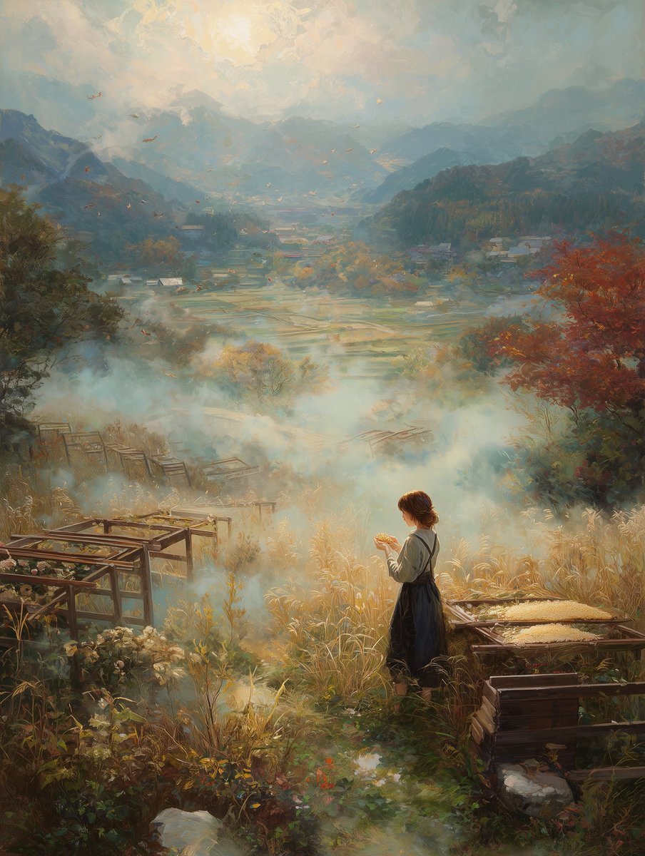 本日10/28は「信濃町・霧下そばの日」だそうです ――『霧下の実り』 霧が溶けるとき、 畑は金に光り、そばの香りが風に漂う。 指の間でこぼれる粒は、 この土地の朝を覚えている。 紅葉が遠くの山を染め、 人は静かに、大地の息を聴く。 #AIart #AIイラスト #信濃町・霧下そばの日 pic.x.com/rSB7IDfBXL