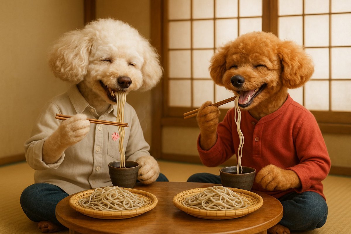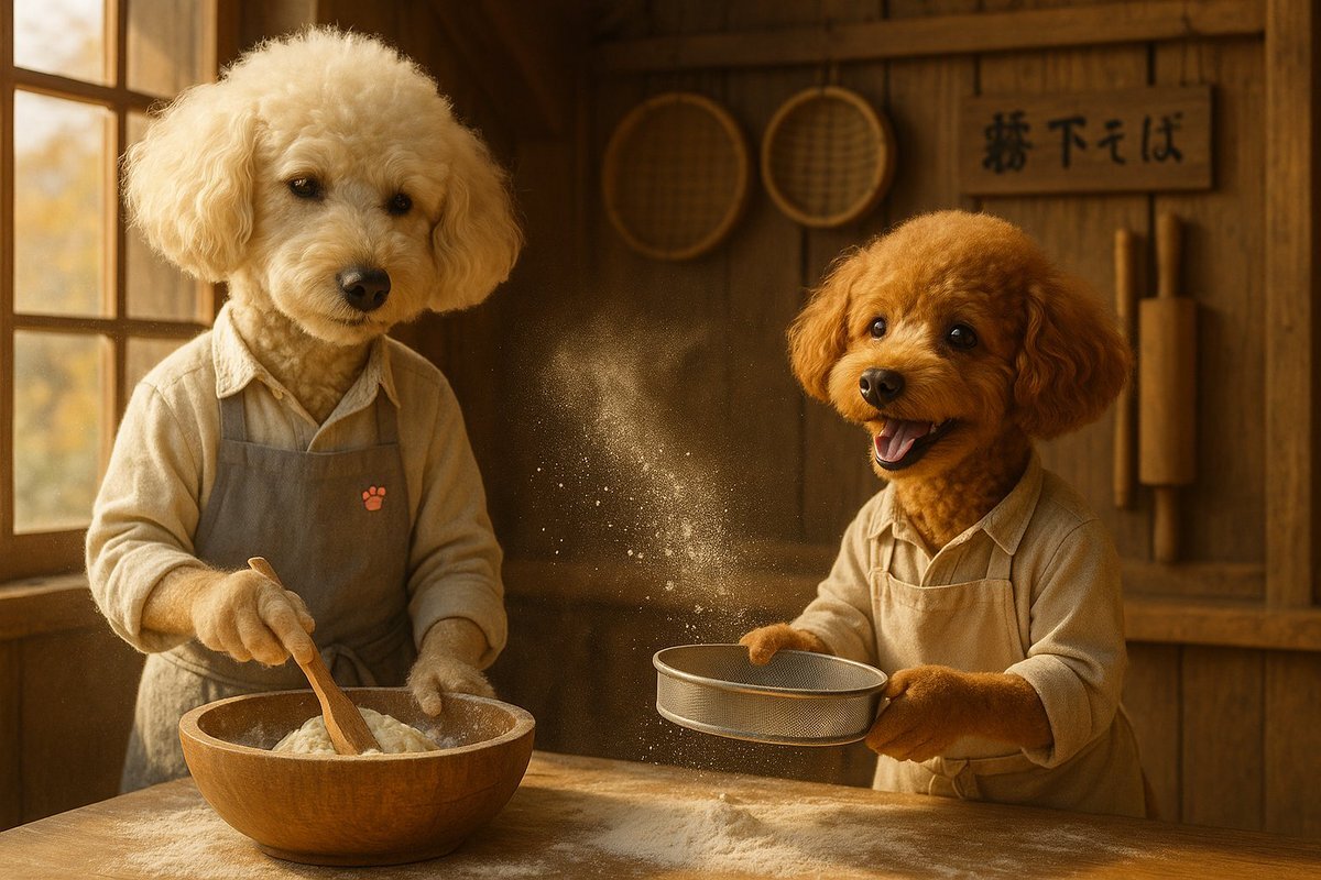 本日のワンショット🐶 🐾実写風シリーズ🐾 粉からこねて、のばして切って…✨ 兄弟で打ったおそば、いただきます!😋 自分たちで作る味は格別🍜💛 でちゅ~~~🐶💕💕💕 #トイプー #犬好きさんと繋がりたい #AIイラスト #信濃町・霧下そばの日 pic.x.com/PjsAhif4p4