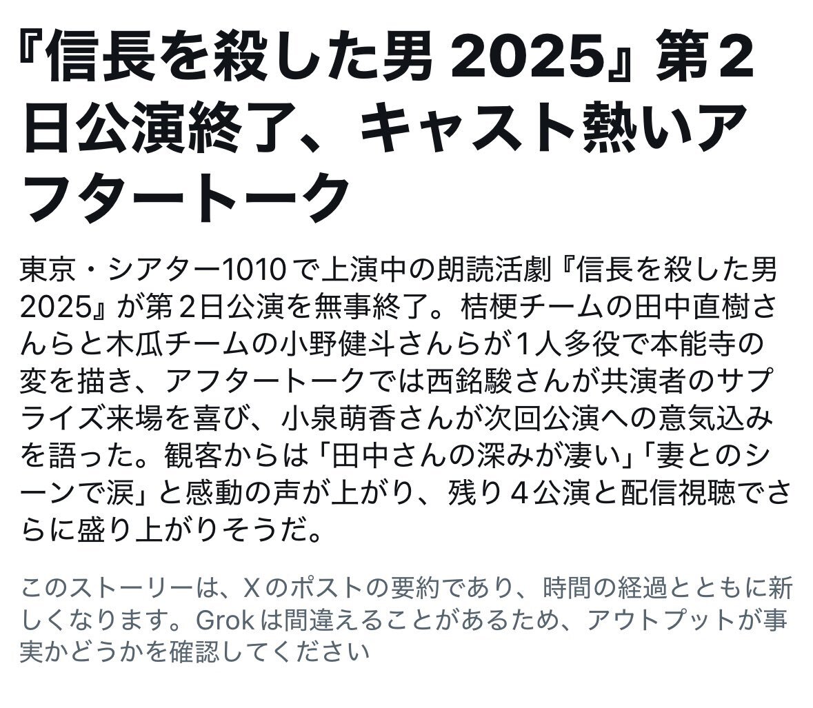 アフタートークが聞きたくて仕事終わりに観に行きました(当日券)田中さんが感想を呟いてくださいねって仰ったので→田中さんの明智光秀は信念があって優しくて愛が溢れてて凛としてました😊全公演後に感想とトークのメモを投稿します #信長を殺した男2025 #田中直樹(#ココリコ) pic.x.com/e96FkqRjgx x.com/Radio_usagimim…