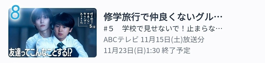あー5位の瞬間 見逃した! 深夜BLで5位はまじ凄い💞 おめでとうございます👏 そしてこの作品をドラマ化して下さって本当にありがとうございます! #ドラマ修学旅行 #修仲 x.com/dramal_abc/sta…