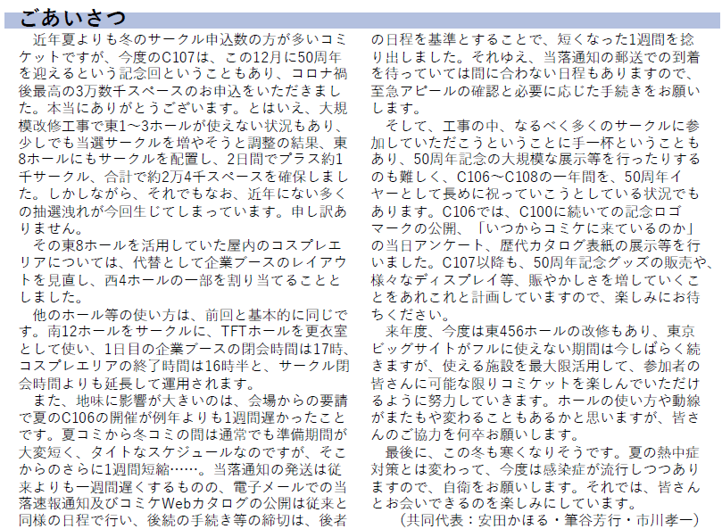 10月の段階でもポストし、アピール挨拶でもご説明しましたが、C107はコロナ禍後最高の3万数千スペースの申込がありました。東8にもサークルを配置し、2日間でプラス約1千スペースとしましたが、なお、多くの抽選洩れが今回生じてしまっています。申し訳ありません。詳しくは下記をご参照下さい。 x.com/comiketofficia…